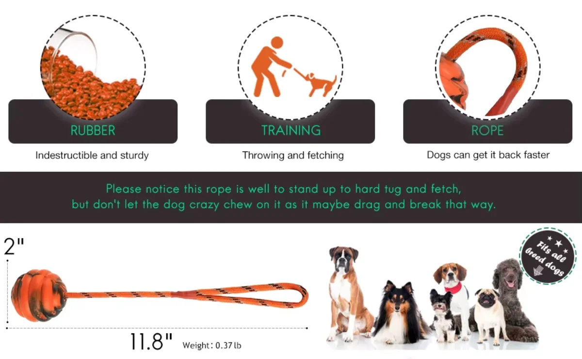 Este juguete es una forma increíble de ejercitar caninos con enorme energía.La cuerda firmemente adherida permite lanzar la pelota a larga distancia, la goma semidura da un agradable rebote a la pelota al aterrizar y facilita su agarre.Ni siquiera necesitas tener un buen brazo de lanzamiento.Todos pueden hacerlo.