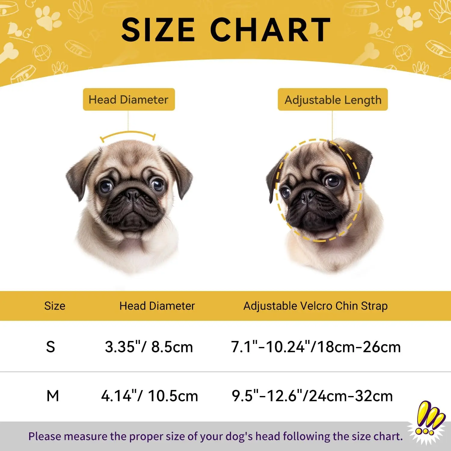 Talla M para perros pequeños o gatos grandes, diámetro de la cabeza: 4,41 ", correa de barbilla ajustable: 9,5"-12,6 ", la correa de velcro para la barbilla asegurará eficazmente el sombrero a la cabeza del perro.