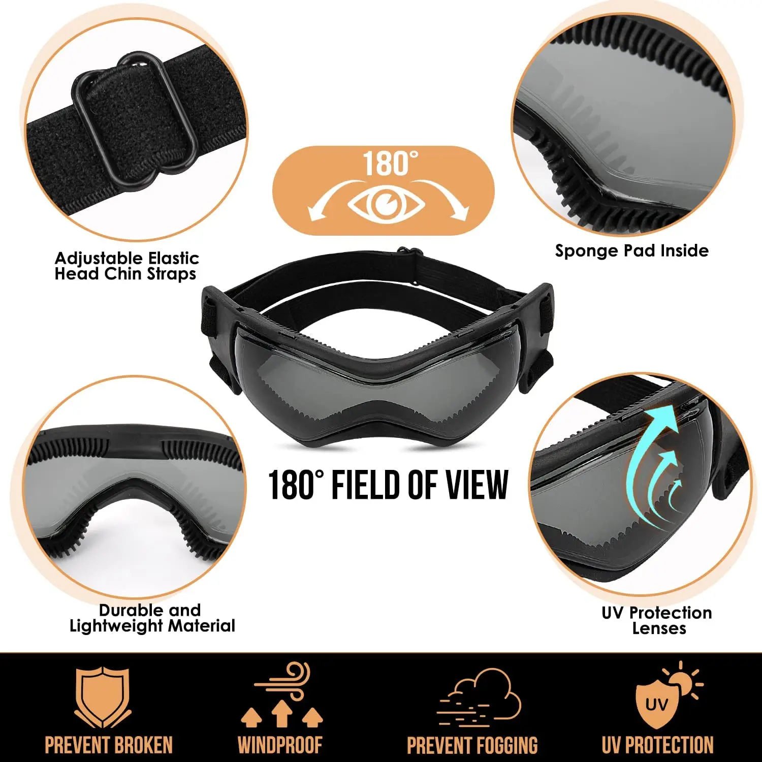 Buena protección: cuando su mascota permanece al aire libre, las gafas de sol para perros pueden mantener los ojos de la mascota alejados de las molestias causadas por el viento, la arena y la luz solar, combinadas con el casco, un accesorio útil al conducir una motocicleta u otros vehículos al aire libre