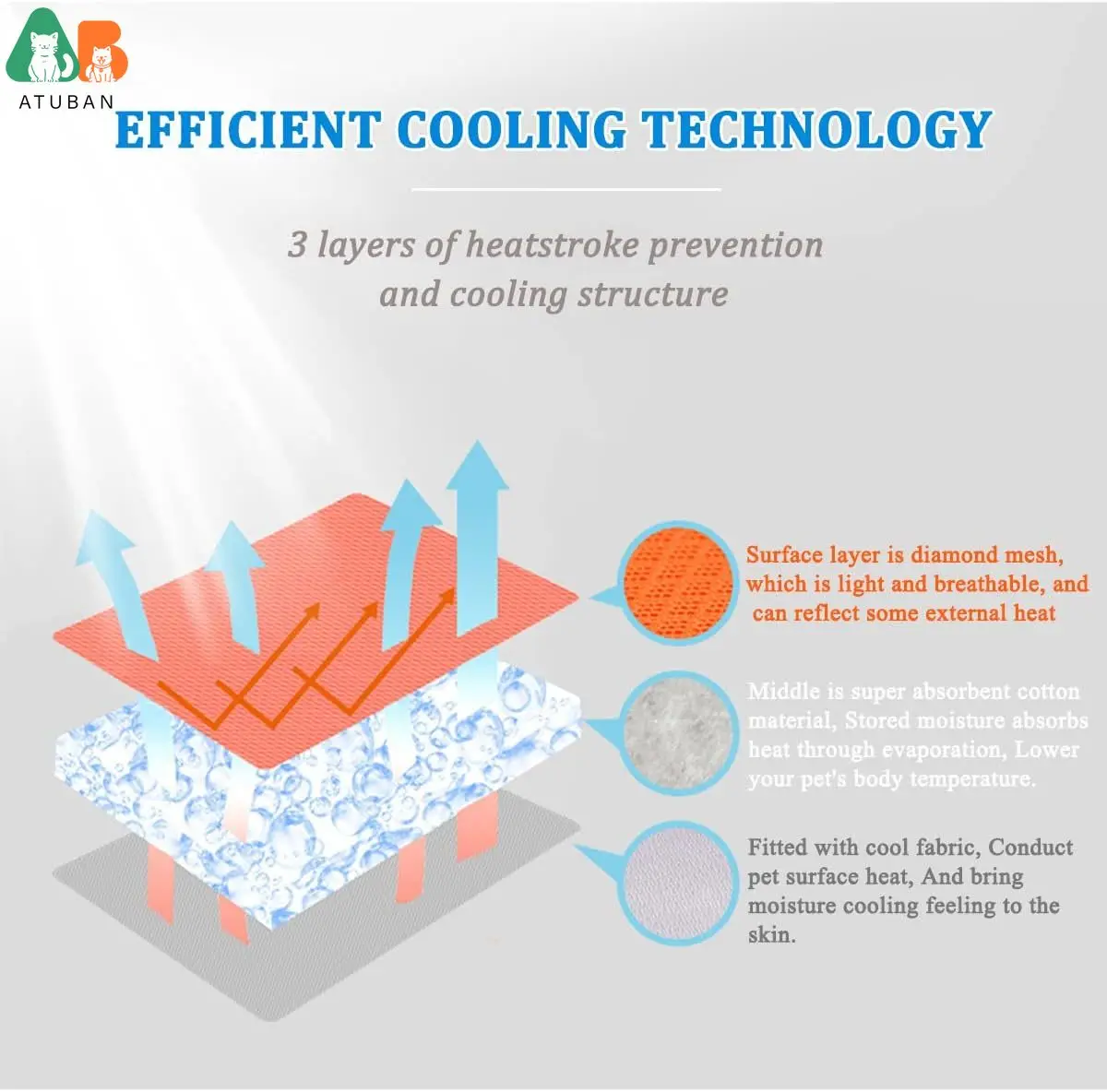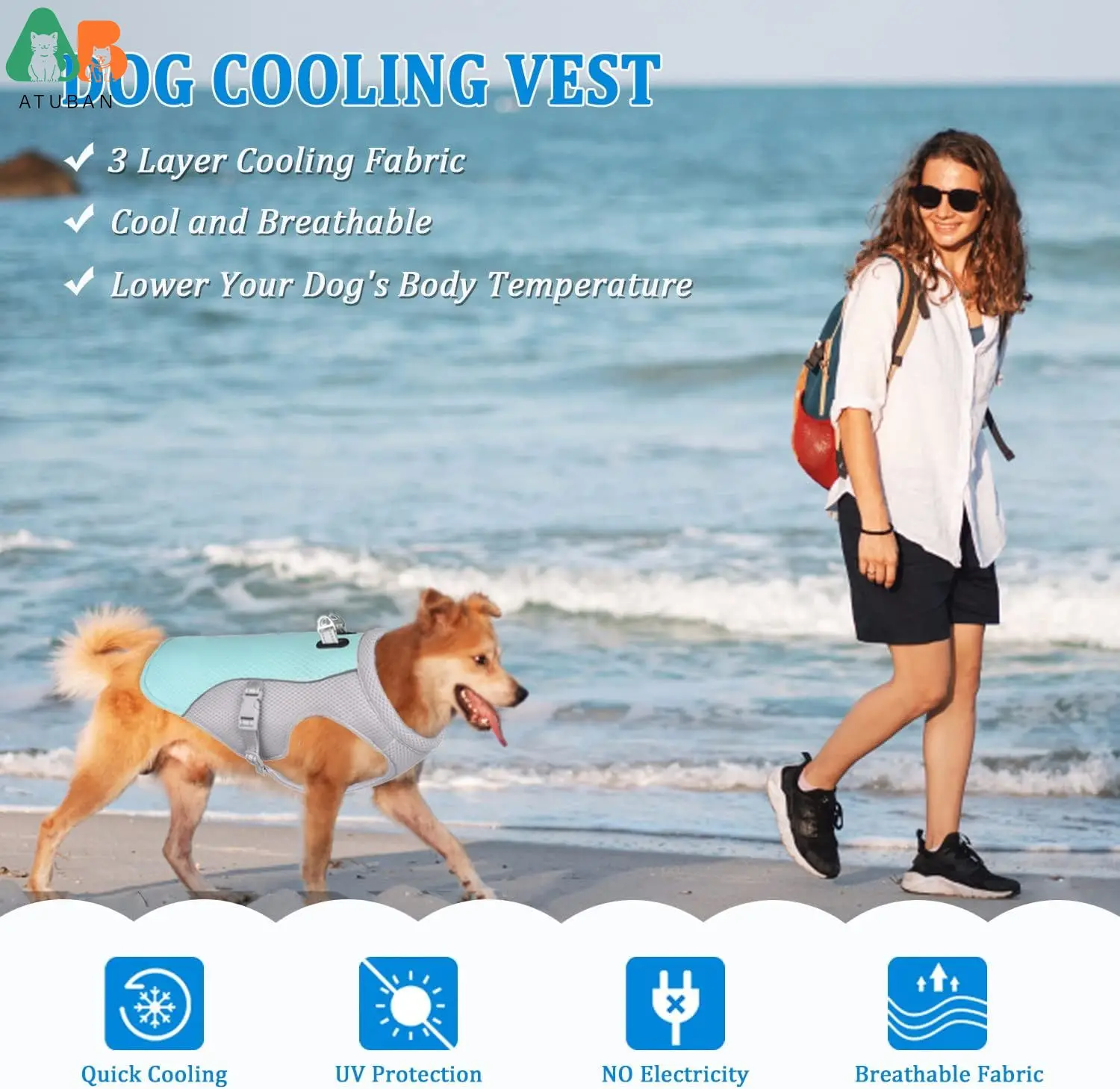 El chaleco de refrigeración para perros ATUBAN proporcionará la máxima refrigeración y comodidad para sus perros. La capa exterior de absorción facilita la evaporación, la capa intermedia absorbente retiene el agua para la evaporación y la capa interior suave transfiere un efecto de enfriamiento al perro.