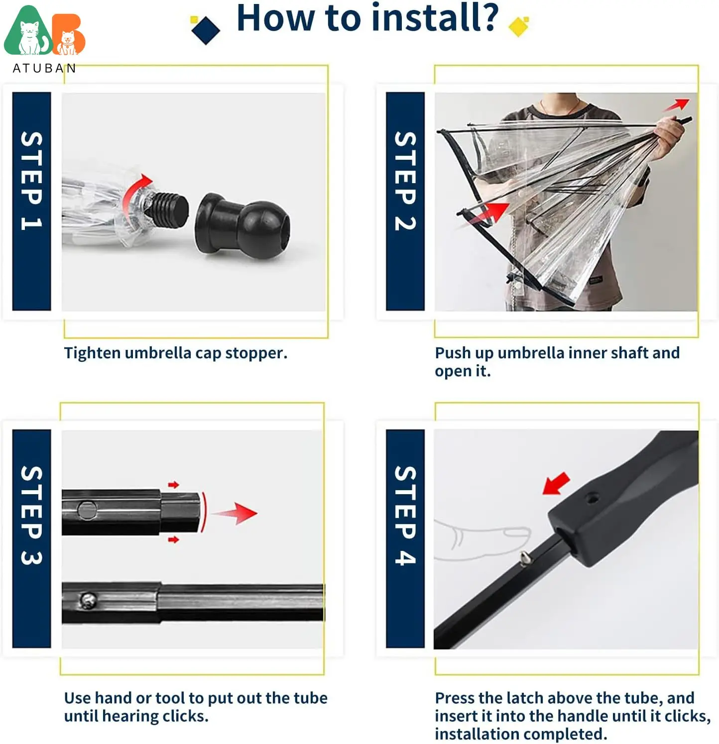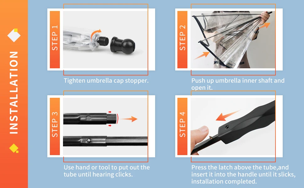 El eje del paraguas para perros pequeños es retráctil, saque el tubo interior con la mano o con unos alicates, luego presione el pestillo del tubo e insértelo en el mango hasta que haga clic.Viene con manual de montaje como referencia.