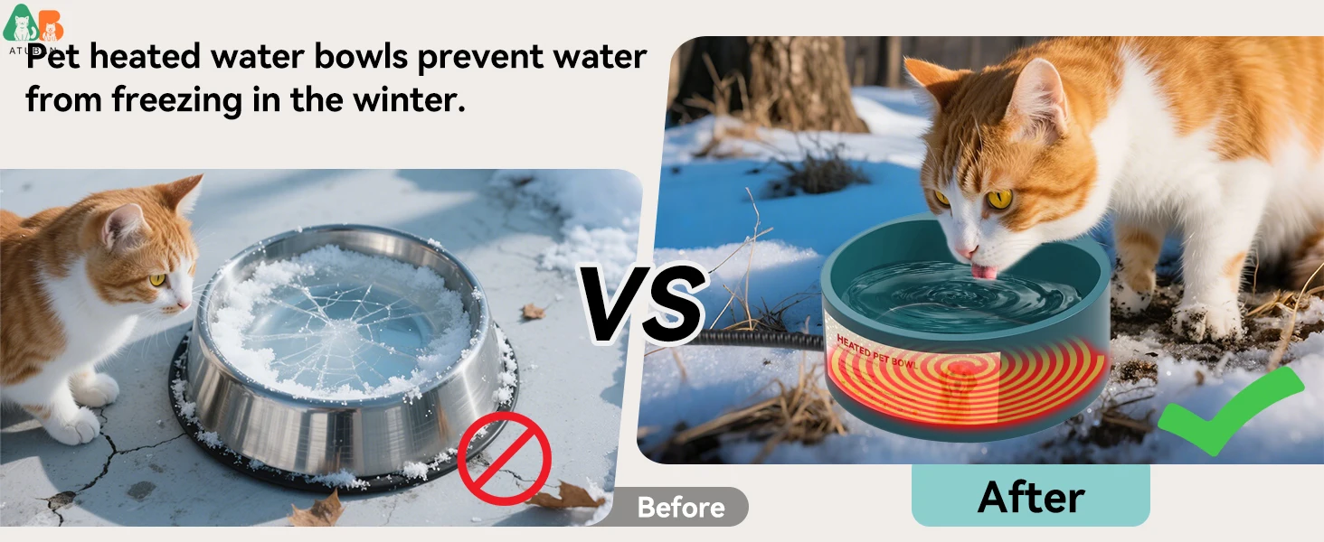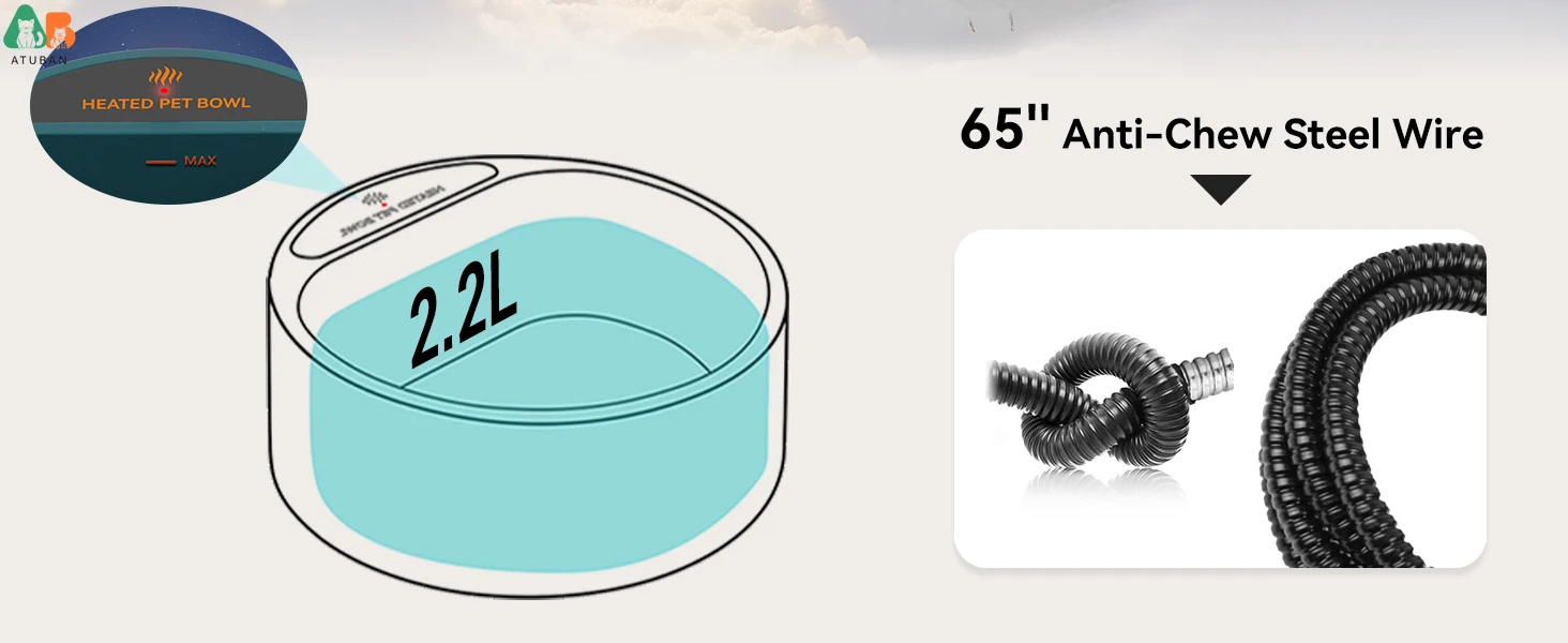 Cuenco de agua calentado seguro: hecho de material libre de BPA, sin olores terribles, no tóxico; Enchufe estándar de EE. UU., fácil configuración plug and play; El cable envuelto en acero está muy bien protegido contra masticación o daños para proporcionar un entorno de uso seguro.