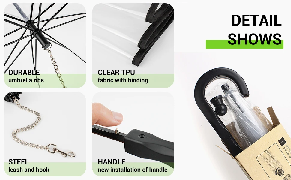 Paraguas para perro: la longitud del mango del paraguas para mascotas se puede estirar y retirar.Si tu perro tiene miedo al paraguas, tendrás que alentarlo y entrenarlo repetidamente para acostumbrarte.
