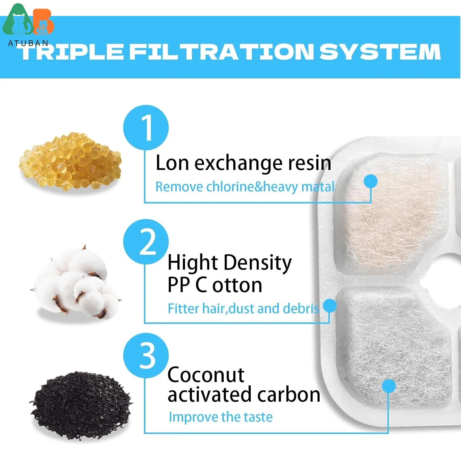Triple filtración para agua limpia: cada filtro cuenta con carbón activado para reducir los olores y el cloro, resina de intercambio iónico para neutralizar las impurezas y tela no tejida para capturar el pelo y la suciedad ayudando a brindar agua fresca y de excelente sabor a que disfrutan sus mascotas.