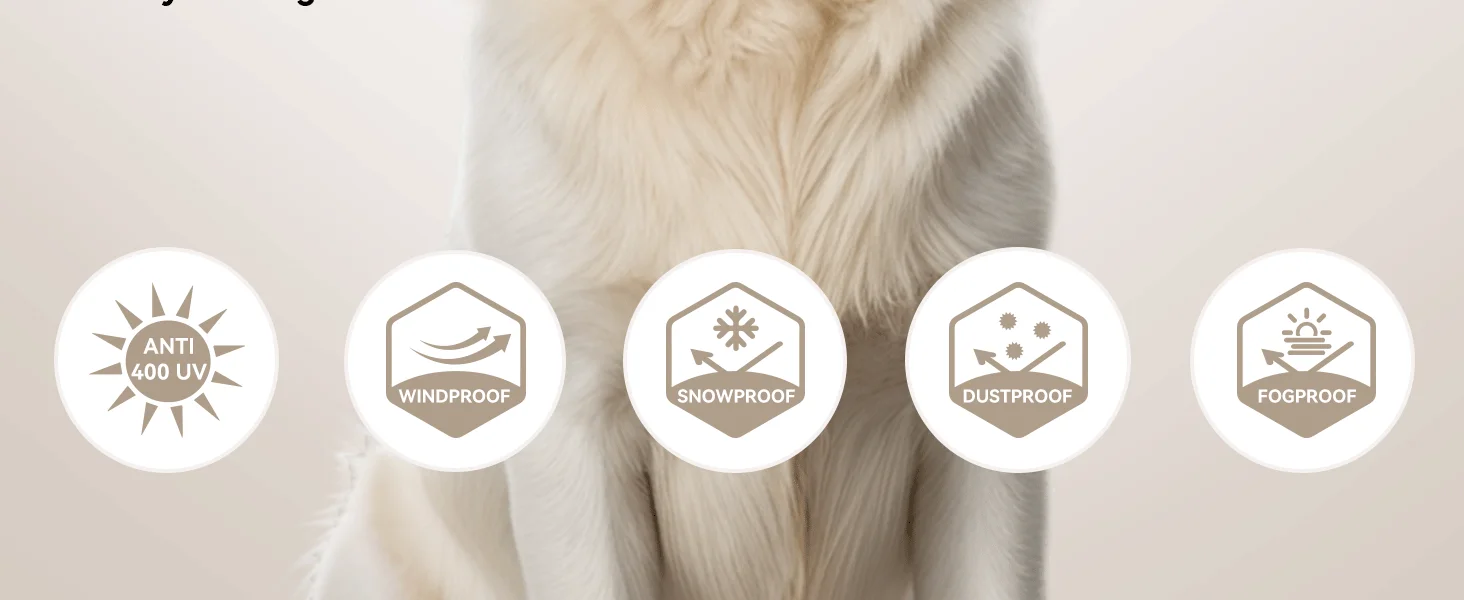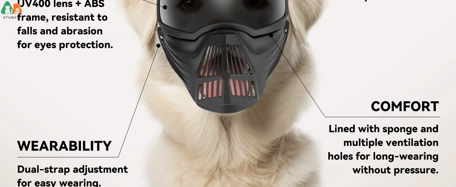Protección integral: la lente curva negra translúcida ha pasado las pruebas UV400, no solo puede bloquear eficazmente los rayos UV, sino que también evita que el viento, el polvo, los escombros y los insectos voladores entren en los ojos de la mascota.Si ejercita a su perro donde haya muchos peligros para los ojos, estas gafas integrales son una buena opción.