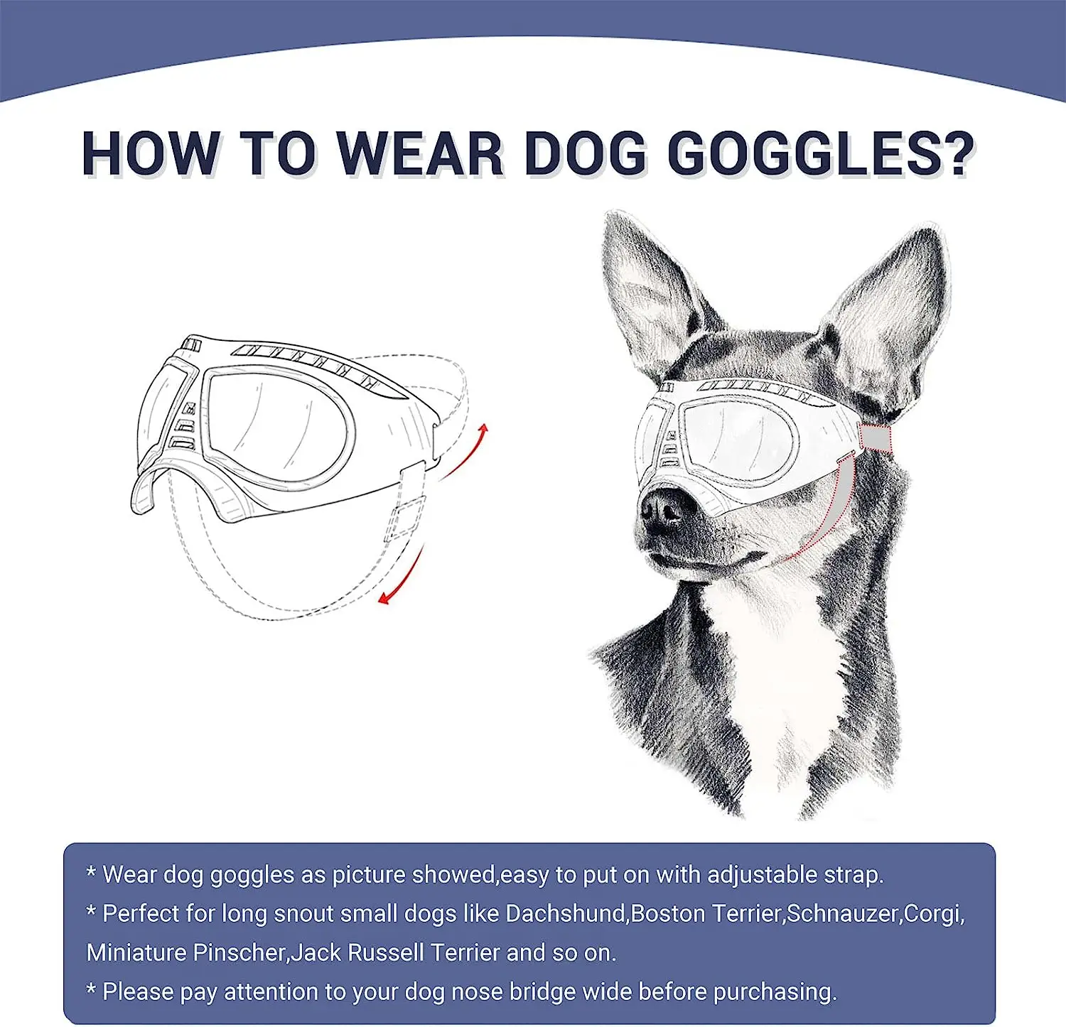 Material de primera calidad: El marco hecho de material TPE suave, es flexible para que sea adecuado para la mayoría de las caras de perros. El diseño se adapta a la cara y los ojos del perro, la suficiente curvatura de la montura y las lentes elevadas hacen que las gafas no rayen los ojos del perro.
