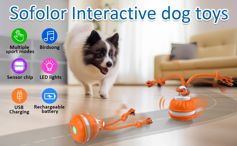 El juguete interactivo para perros Sofolor es la combinación perfecta de pelotas eléctricas para perros y juguetes de cuerda para perros, bolas de movimiento rápido y cuerda oscilante pueden estimular la energía del perro y permitir que haga más ejercicio.