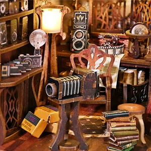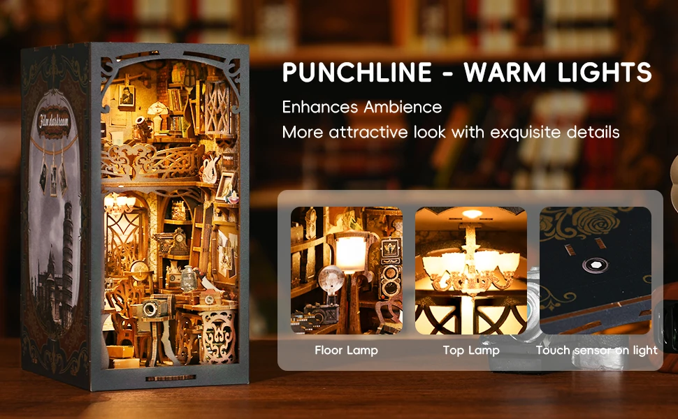 【Kit Book Nook 】�� Tema: cuarto oscuro de película. El kit DIY Book Nook te lleva de vuelta a los viejos tiempos de la era del cine con una configuración completa de cuarto oscuro. El Kit de casa de muñecas tiene dos pisos. El primer piso es el lugar de rodaje, completo con cámaras antiguas, rollos de película, fotos, marcos de fotos, etc. El segundo piso es el cuarto oscuro donde se revela la película, lo que lo transporta instantáneamente a esa era de la fotografía cinematográfica. ¿Puedes oler el aroma químico familiar de la película reveladora?