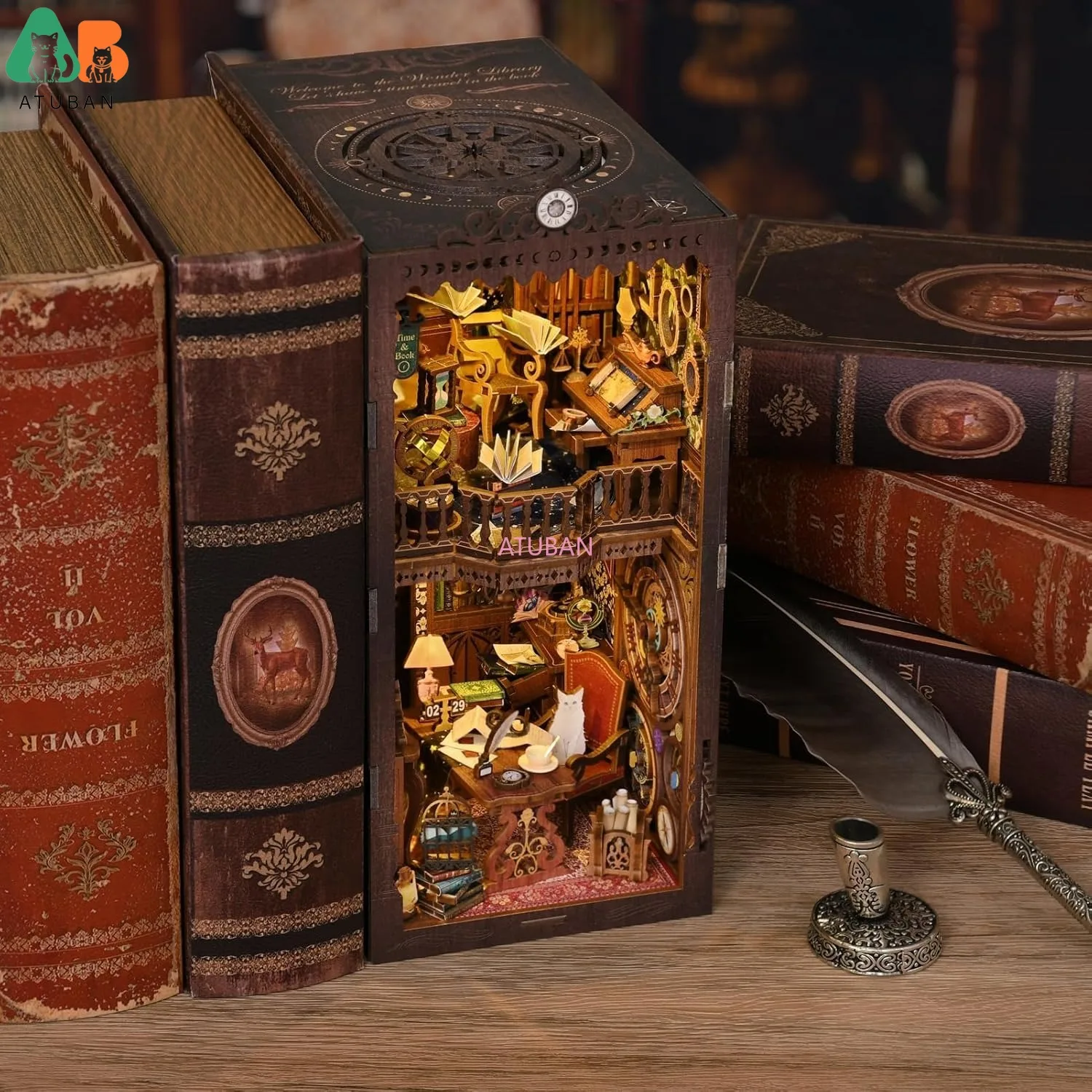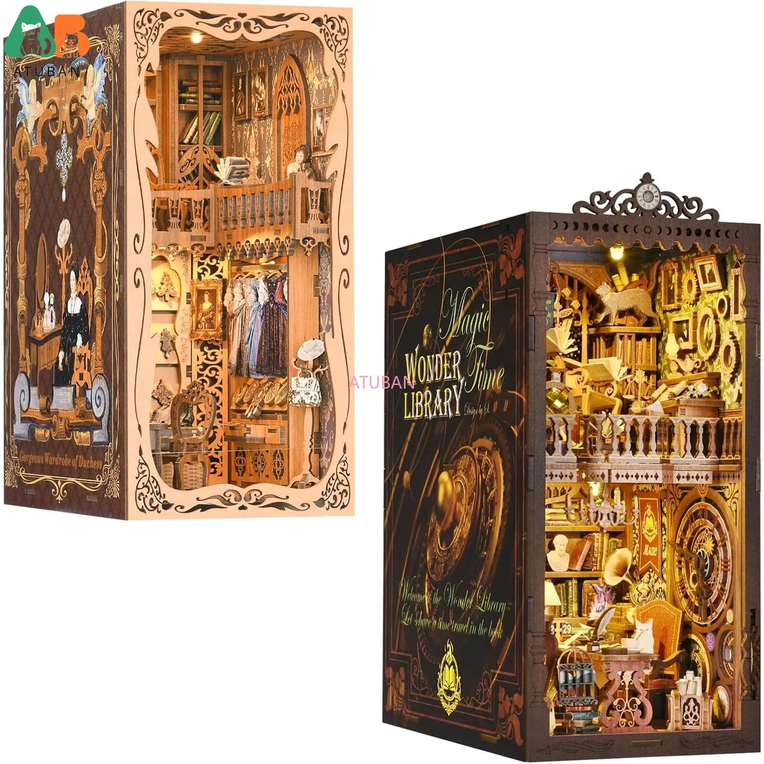 ATUBAN Kits de rincón de libros DIY, rompecabezas de madera 3D, kits de modelos de sujetalibros decorativos con inserción de estantería con LED, Kit de casa de muñecas Diorama DIY
