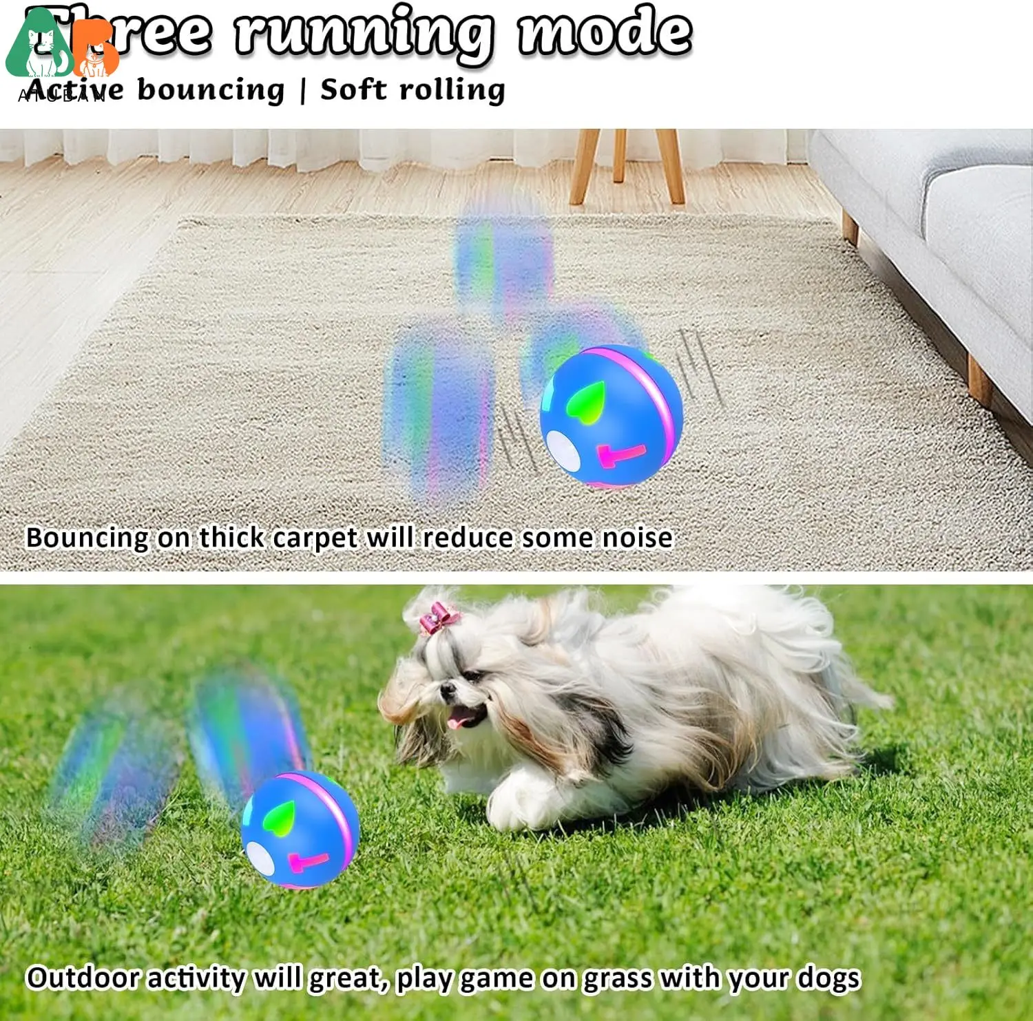Pelota Peppy PET eléctrica con motor. TRES modos disponibles: modo Rolls, modo Roll-Jump, modo interactivo. La pelota de perro interactiva para saltar funciona muy bien en la alfombra, pero causa ruido si rebota en el suelo de madera