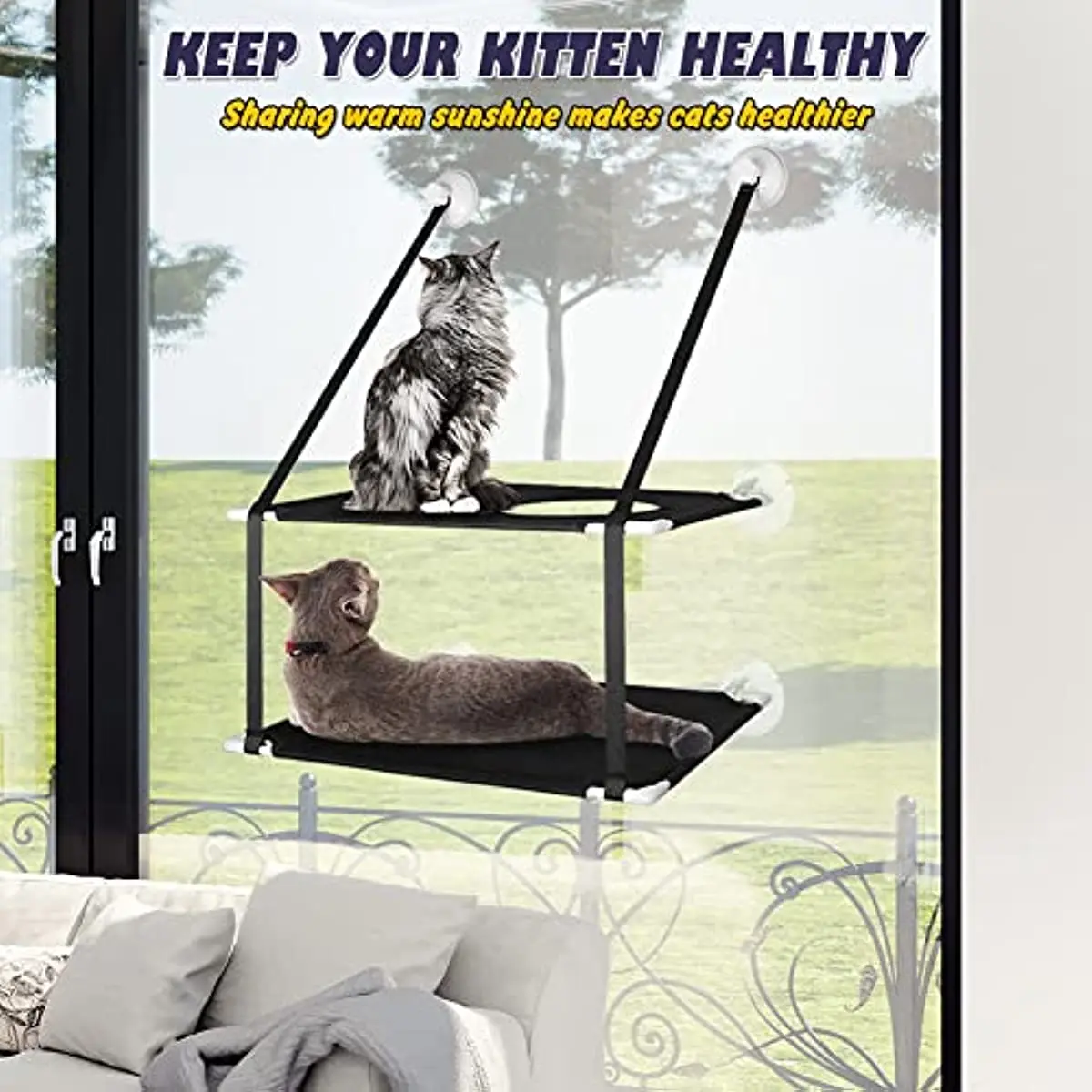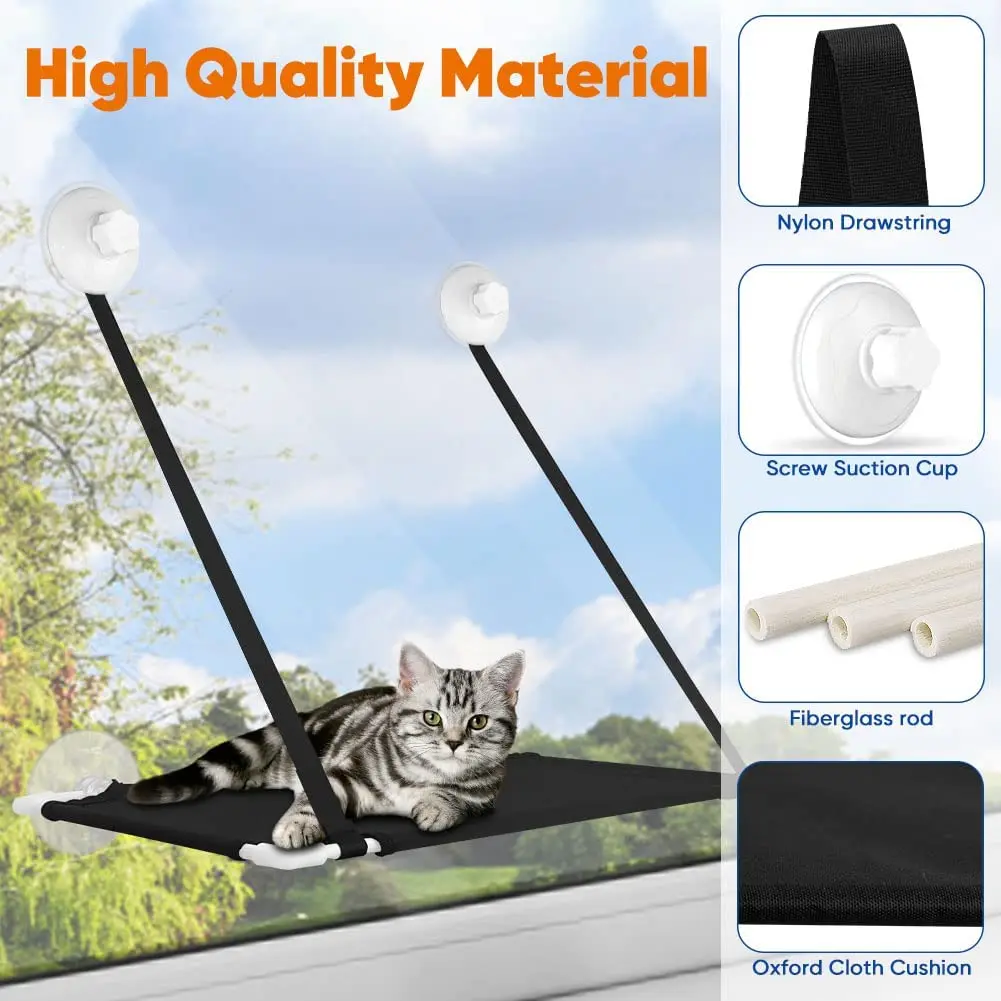 Material de alta calidad y salud: la hamaca para gatos con ventana consta de un cojín de tela Oxford transpirable de alta calidad, un tubo de fibra de vidrio resistente y una ventosa de goma de plástico. El cojín de tela Oxford es resistente, extraíble, impermeable y fácil de limpiar. El tubo de fibra de vidrio de alta calidad y la ventosa hacen que la percha sea más estable y brindan un espacio de descanso saludable y seguro para sus gatos.