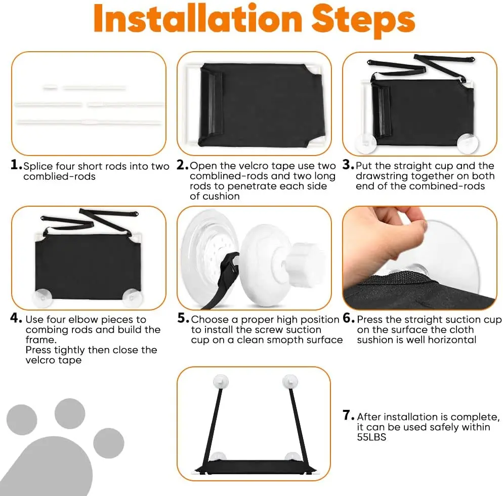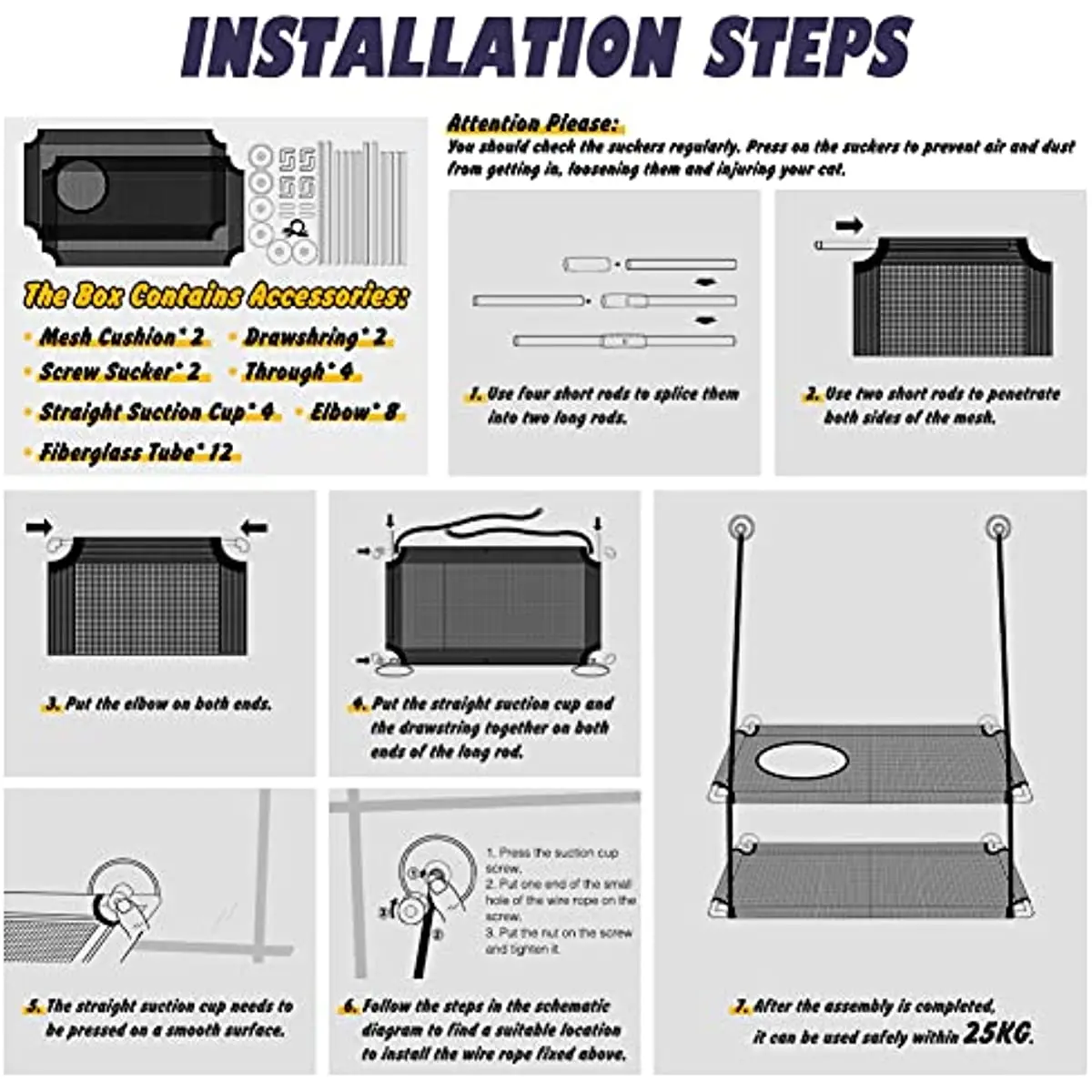 【5 minutos para divertirse】 - No se necesitan herramientas, simplemente siga los pasos de las instrucciones para ensamblar los accesorios y luego pegue las ventosas firmemente en la ventana lisa y limpia de arriba a abajo.Puede instalar esta percha para gatos con ventana en su hogar en unos minutos y brindarle mucha diversión a su lindo gato.