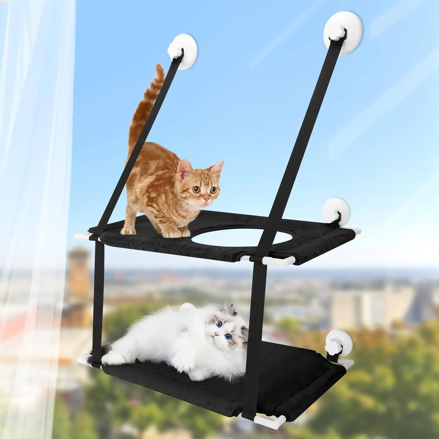 Material de alta calidad y salud: la hamaca para gatos con ventana consta de un cojín de tela Oxford transpirable de alta calidad, un tubo de fibra de vidrio resistente y una ventosa de goma de plástico. El cojín de tela Oxford es resistente, extraíble, impermeable y fácil de limpiar. El tubo de fibra de vidrio de alta calidad y la ventosa hacen que la percha sea más estable y brindan un espacio de descanso saludable y seguro para sus gatos.