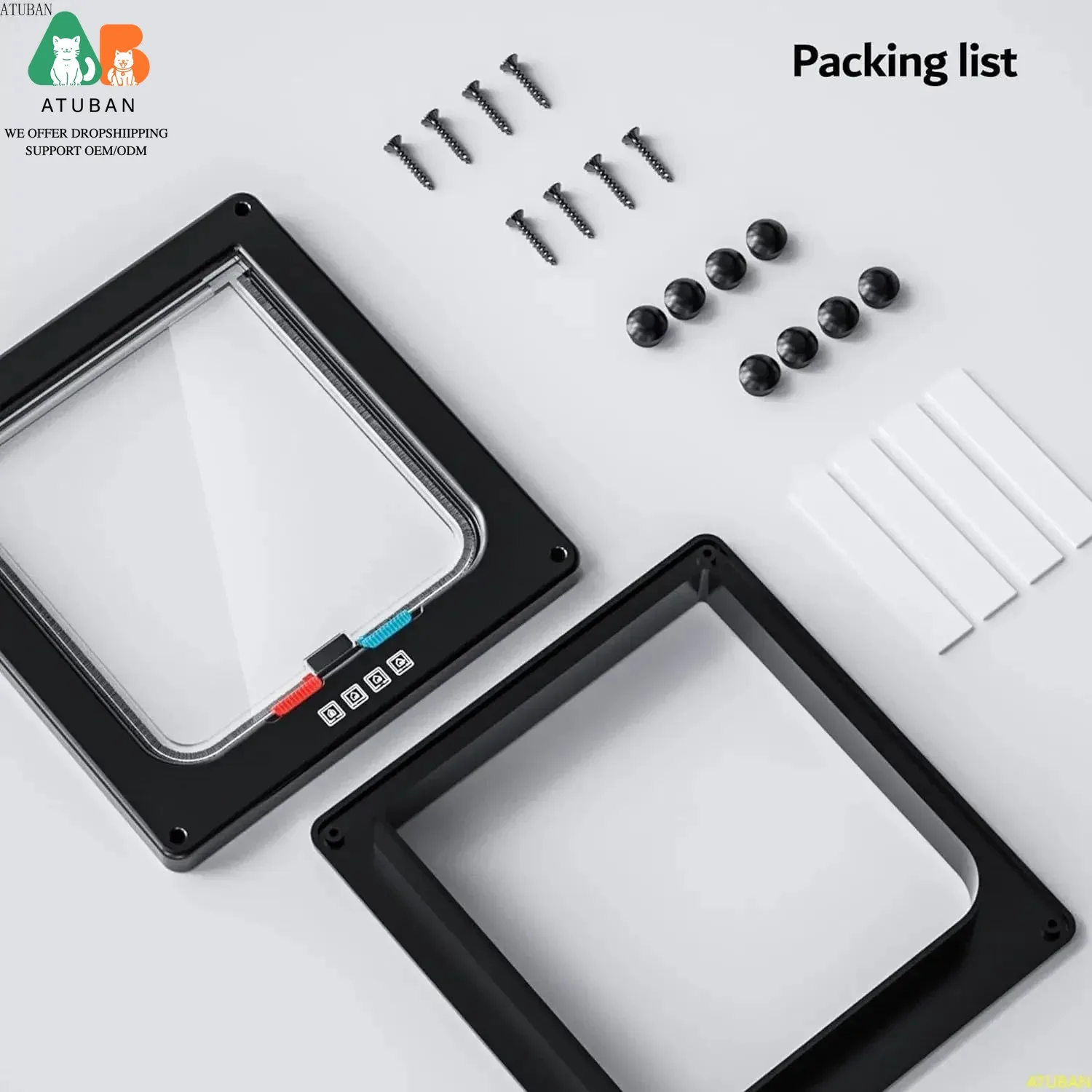 Puerta para gatos con 4 modos de interruptor: esta puerta para gatos tiene cuatro modos de bloqueo independientes, que se pueden controlar fácilmente con interruptores.Puede optar por permitir que su gato se balancee únicamente, entre solo, entre y salga libremente o bloquee completamente la puerta para evitar que su gato entre o salga.Es una forma conveniente de darle a su amigo peludo la libertad de entrar y salir mientras disfruta mientras mantiene alejados a los visitantes no deseados. 2 Aplicaciones: Tamaño exterior 7,48" x 7,76" x 0,79"(W x H x P), Tamaño interior: 6,3" x 6,2"(W x H), Tamaño recortado: 6,3" x 6,3" (W x H), adecuado para instalación en puertas y paredes delgadas, adecuado para gatos con más de 28 lb y circunferencia de cintura más corta de 25" 3 Fácil instalación: se incluyen instrucciones completas para que la instalación sea muy sencilla.Esta puerta para gatos se puede instalar fácilmente en ventanas, puertas, armarios y más. 4 Diseño bien pensado ATUBAN: esta puerta para gatos cuenta con una solapa transparente, lo que permite que su mascota vea a través de la puerta.La pantalla exterior es resistente al agua y una tira de cepillo reduce el ruido cuando la puerta se cierra. 5 Calidad asegurada: hecha de plástico ABS duradero, esta puerta para gatos es resistente a la intemperie y está diseñada para durar. La superficie lisa garantiza que resistirá el uso frecuente.ATUBAN