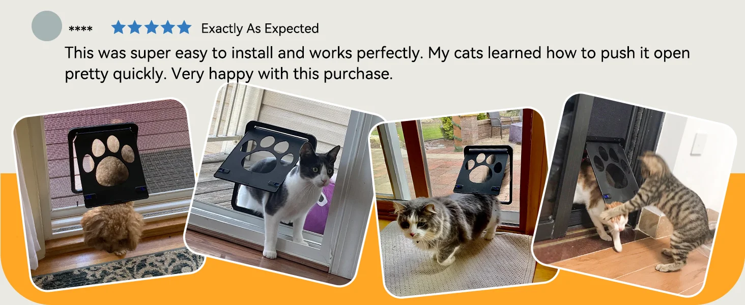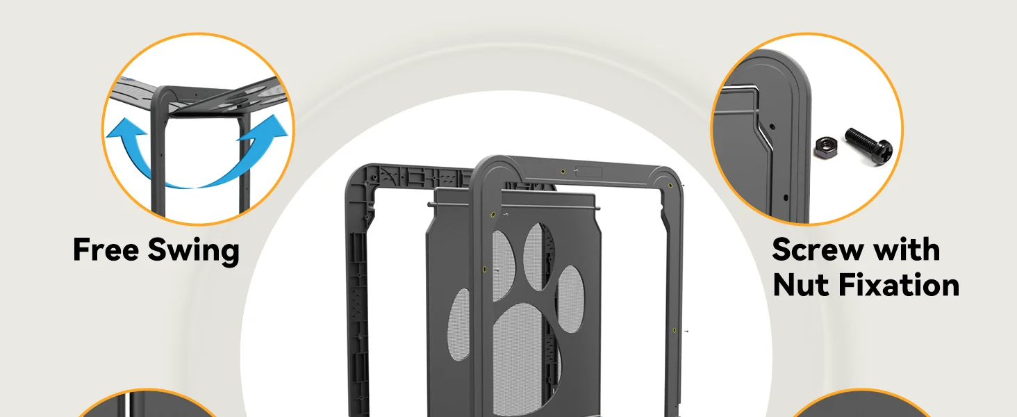 Para obtener mejores resultados, se recomienda la instalación con dos personas.Reforzado con tornillos y tuercas adjuntos para evitar que la puerta se caiga.La solapa de la puerta presenta un inserto de malla decorativo en forma de pata, un complemento encantador y funcional.Los tornillos o la aleta interior de la puerta se pueden reemplazar en cualquier momento si están rotos, son convenientes y económicos.