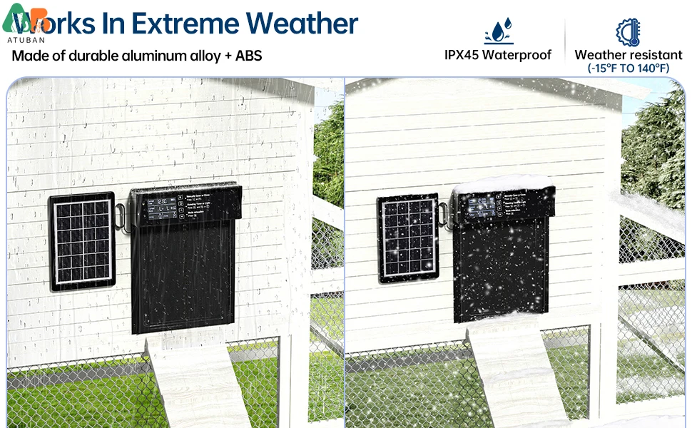 ☀【Construcción de aleación de aluminio duradero】: Nuestra Puerta de gallinero solar está hecha de aleación de aluminio de alta calidad y ABS para garantizar la durabilidad, resistencia al agua y resistencia a la corrosión para soportar todo tipo de clima y entornos hostiles.