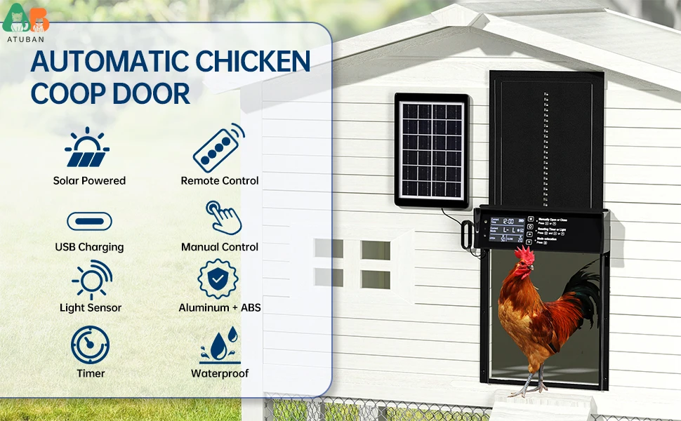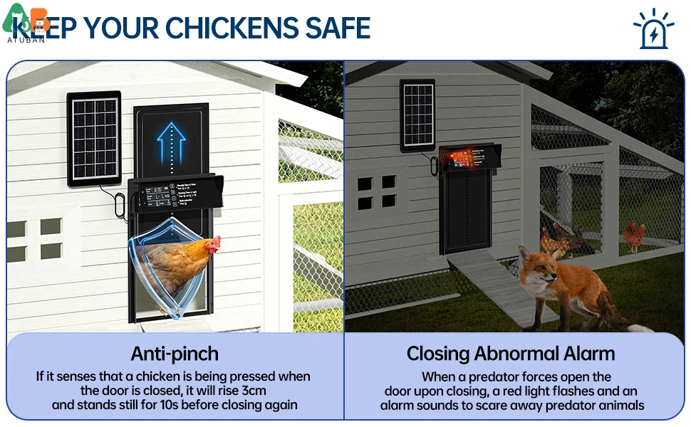 ☀️【Función antipellizco】: pensando en la seguridad de las aves de corral, hemos diseñado la función antipellizco. Si la puerta detecta un ave de corral mientras se cierra, subirá 3cm y se mantendrá inmóvil durante 10s antes de volver a cerrarse. Mantenga sus aves de corral seguras.