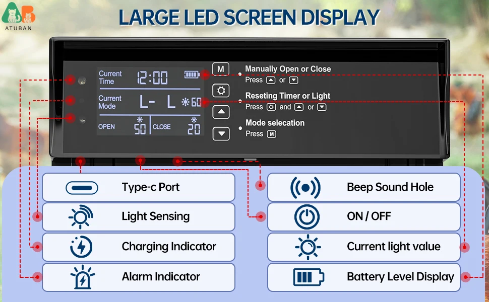☀【Pantalla LED grande】: Equipado con una gran pantalla LED para garantizar una visibilidad óptima, le permite ver de manera fácil y precisa el estado de funcionamiento de la puerta del gallinero automático, incluido el nivel de batería, el tiempo, y valor del sensor de luz, que le brinda una experiencia de usuario más satisfactoria.