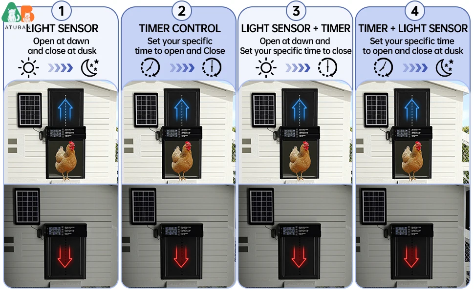☀【Sensor de luz y temporizador】: 4 modos disponibles, que permiten un funcionamiento personalizable mediante temporizador + sensor de luz. Configure el temporizador de 0 a 24 horas; el valor de sensibilidad a la luz es 60 por defecto al día, mientras que el valor de sensibilidad a la luz es 30 por defecto al amanecer. Una vez configurada, la puerta del gallinero funcionará automáticamente, lo que le permitirá disfrutar de unas vacaciones sin preocupaciones.