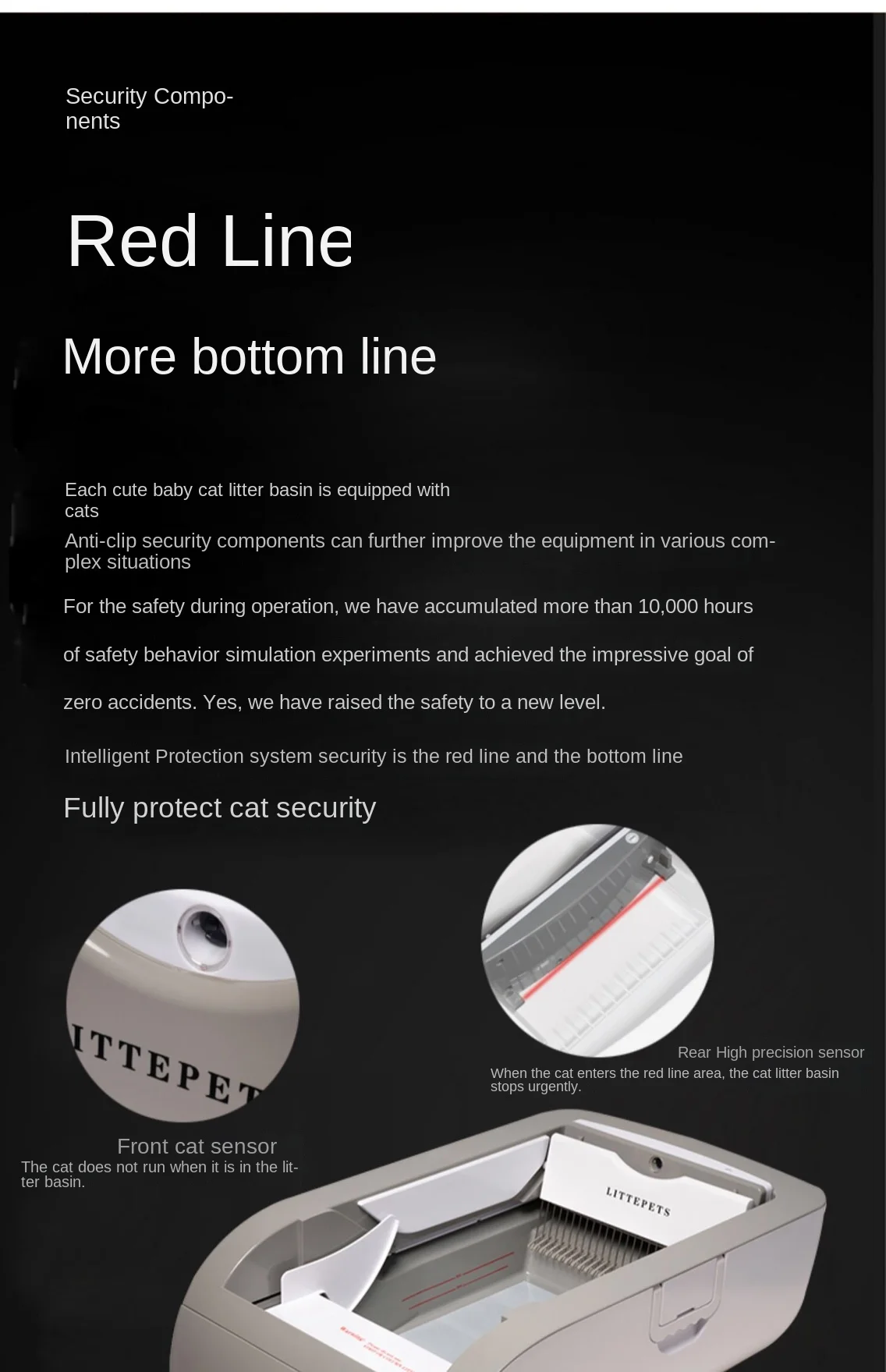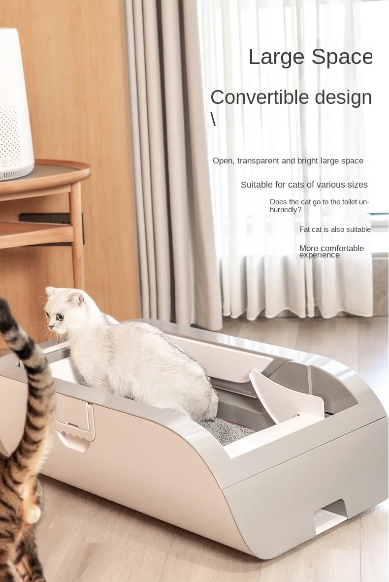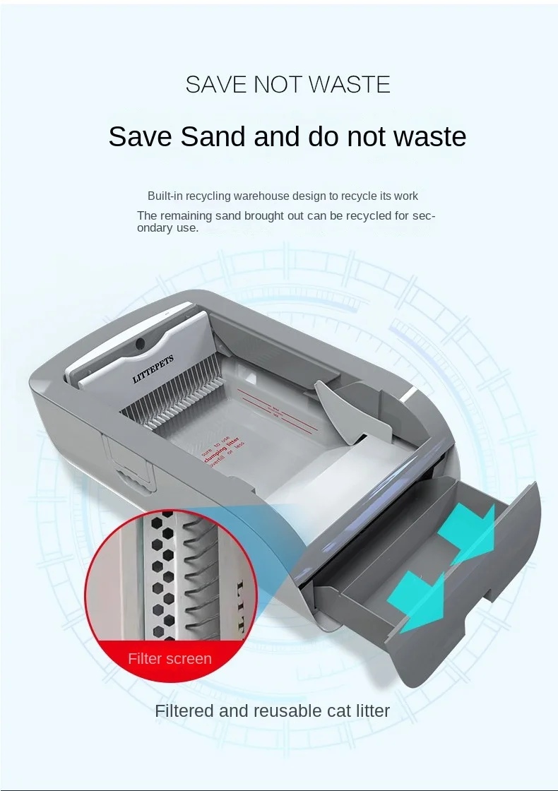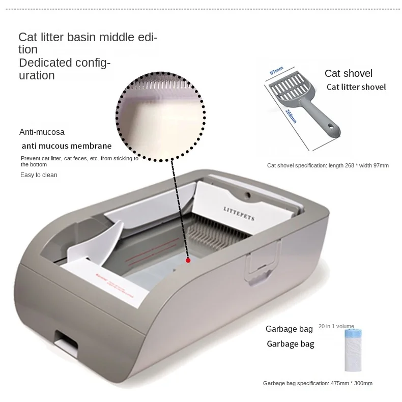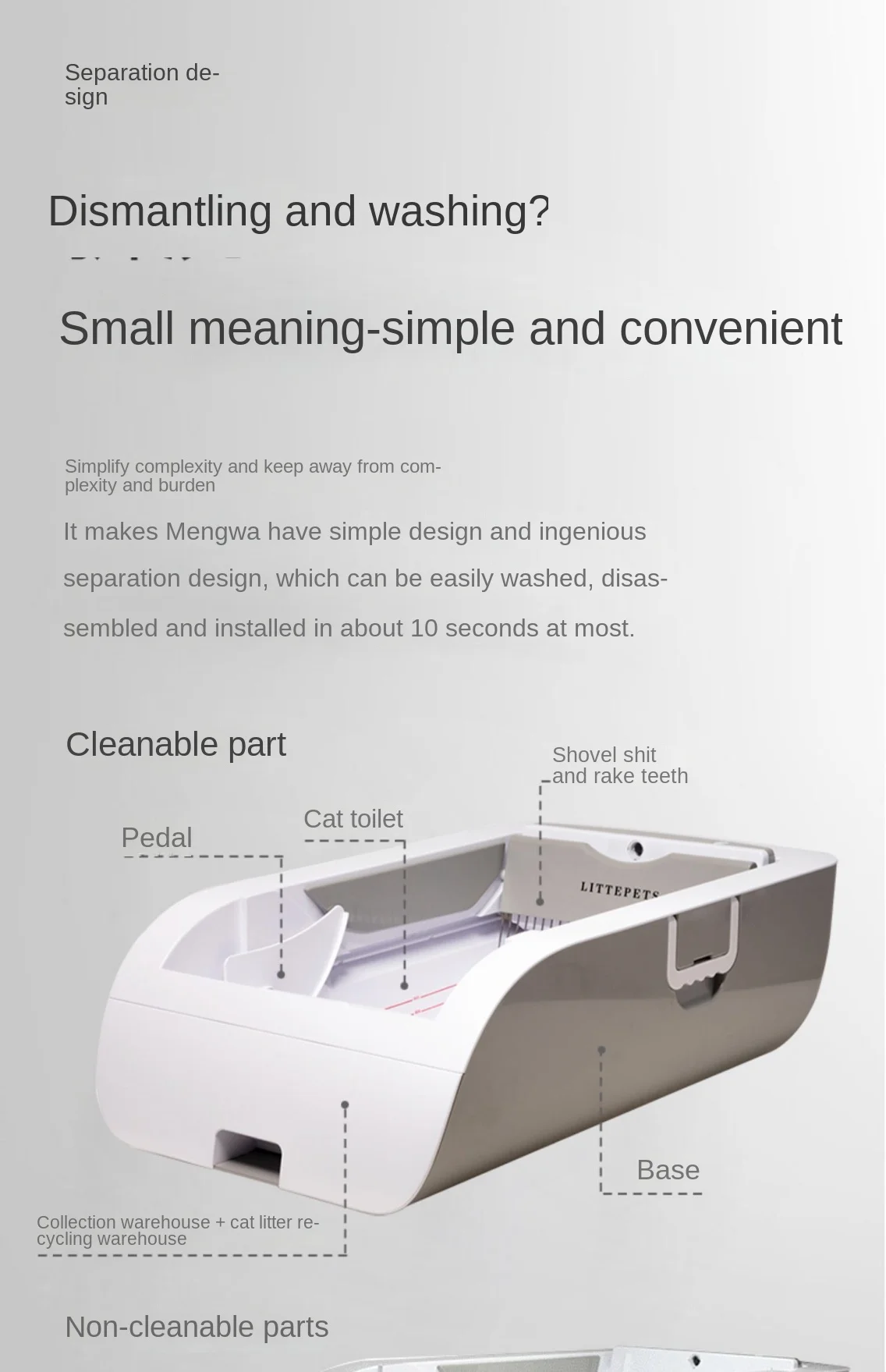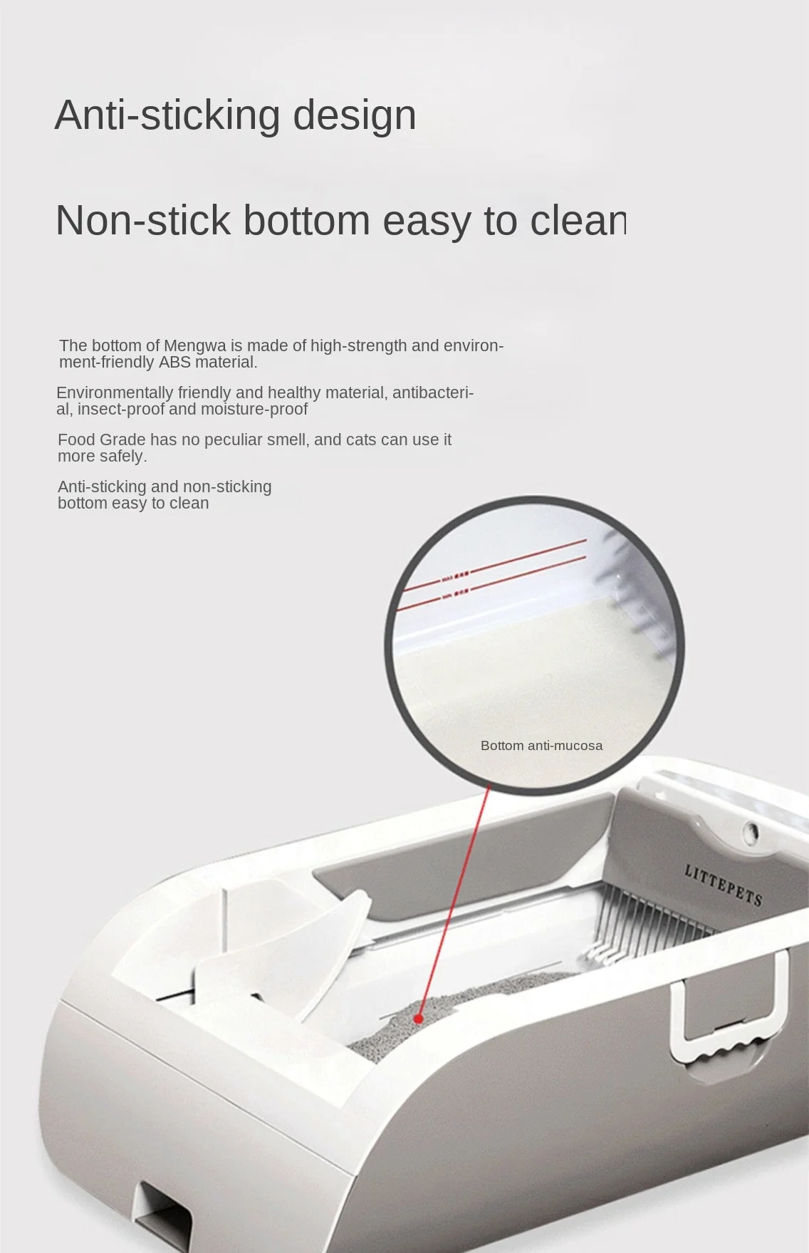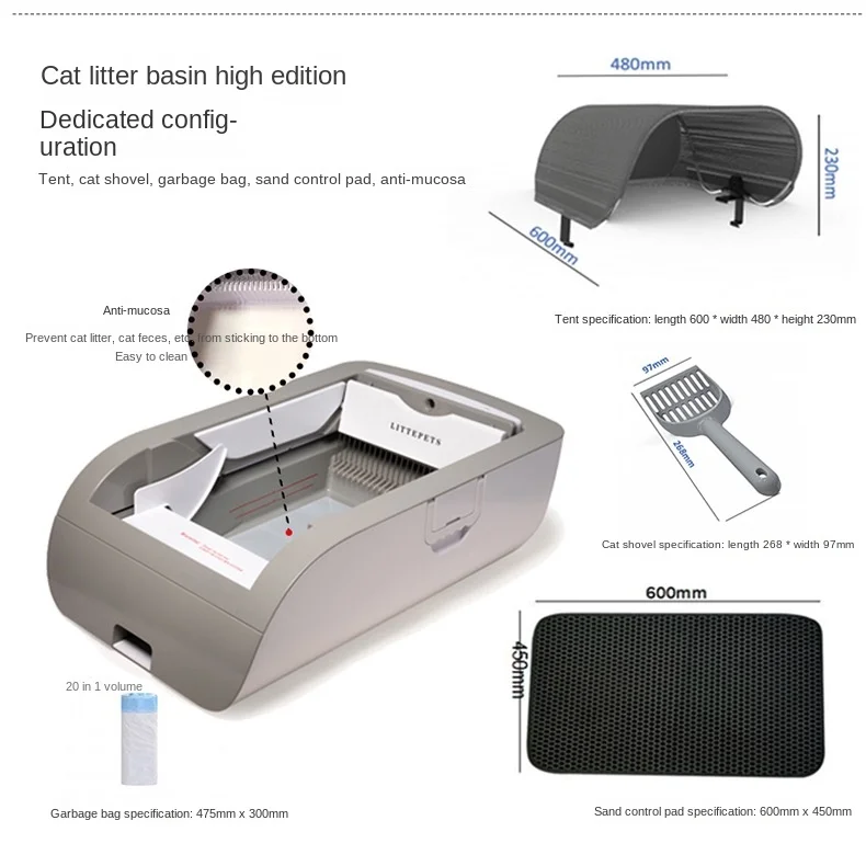 La parte inferior está hecha de material polimérico, no se puede rasparTamaño de la carcasa de la máquina: 760*470*248mm; Tamaño del inodoro para gatos: 400*350mm