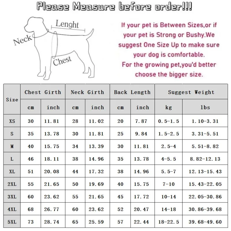 3XL: Pecho 60cm/23,62''; Longitud 45cm/17,72''; Cuello 55cm/21,65''; Peso sugerido 10-14 kg/22,05-30,5 lbs.