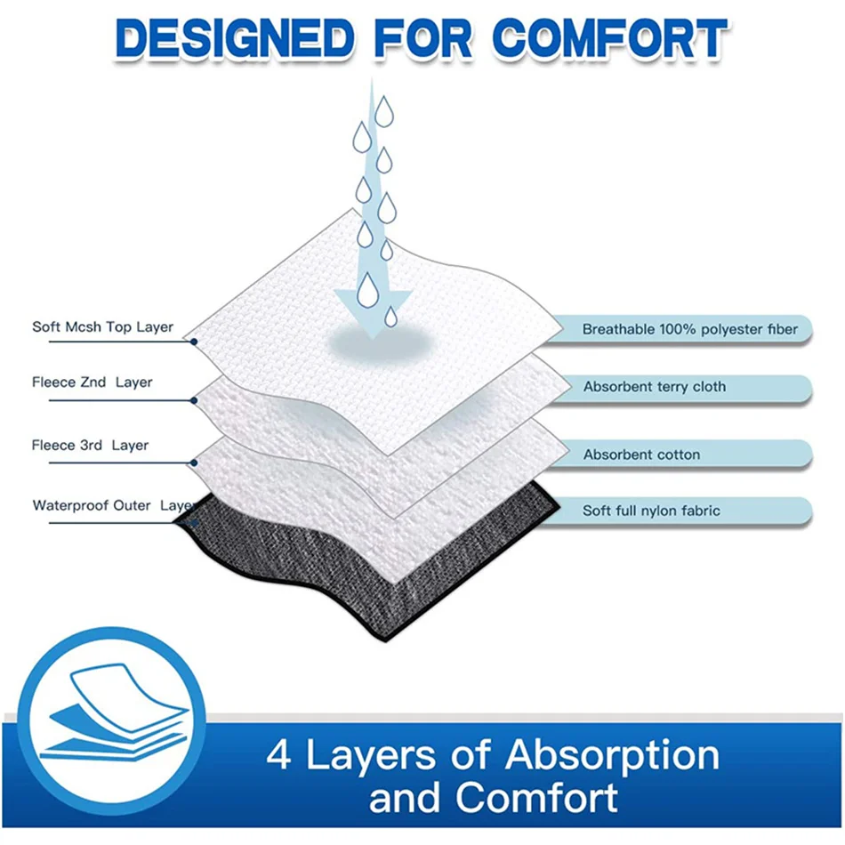Características:Hecho de cómodo tejido impermeable de doble cara, antipermeabilidad, con algodón absorbente en el medio, súper absorbente, retiene eficazmente la humedad y se puede lavar a mano, lavar a máquina y reutilizar.