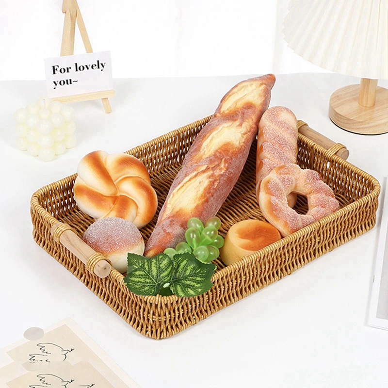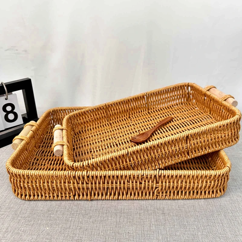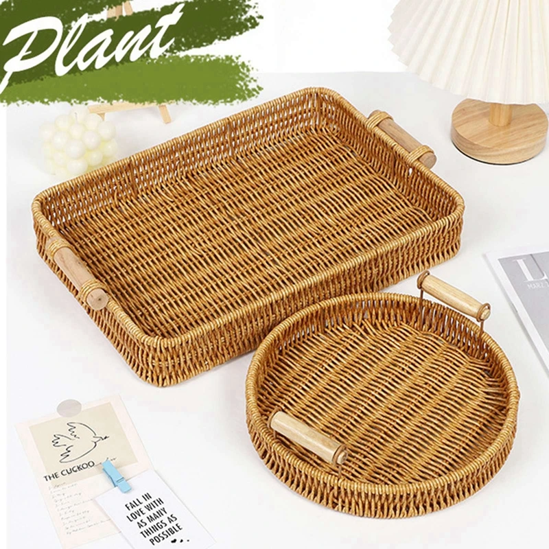 【Cesta más duradera】Estas encantadoras cestas están hechas con material de ratán artificial, lavable y no es fácil de humedecer y deformar. El ASA redonda de la bandeja está hecha de metal, que no es fácil de romper y tiene una mejor textura.