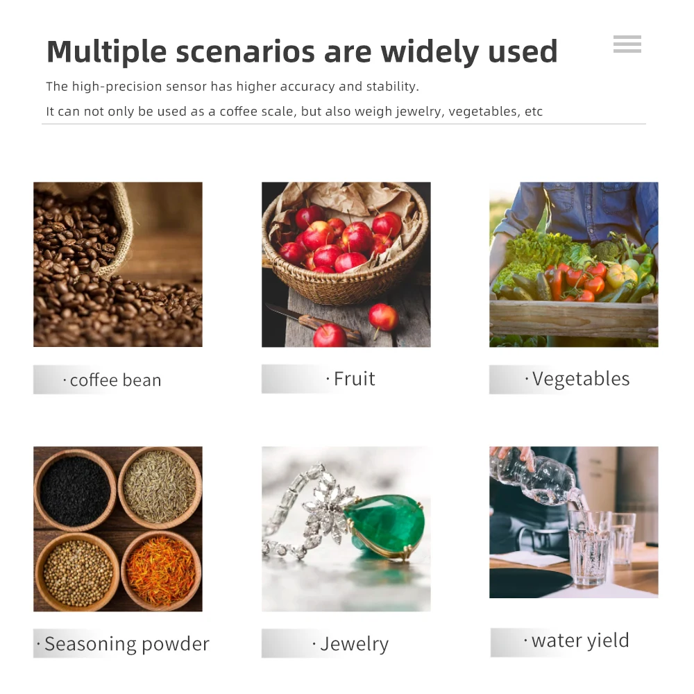 【Báscula de café digital de alta precisión】 Equipada con un sensor de presión de alta sensibilidad, la báscula de café digital presenta un rango de pesaje de 1 g a 3000 g, 0.1 g de alta precisión y 3 unidades de medida (oz/ml/g), que le ayudan a preparar una taza de café con diferentes gustos o a lograr estándares más altos de pesaje en restaurantes, cocinas y bares.