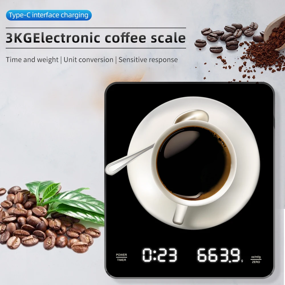 Báscula de café electrónica Batería incorporada Carga Báscula de café de goteo inteligente 3kg 0.1g LED Temporizador automático Verter sobre espresso
