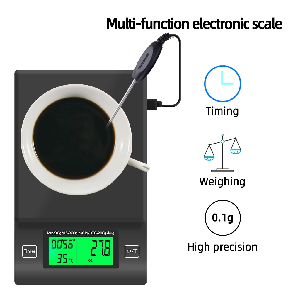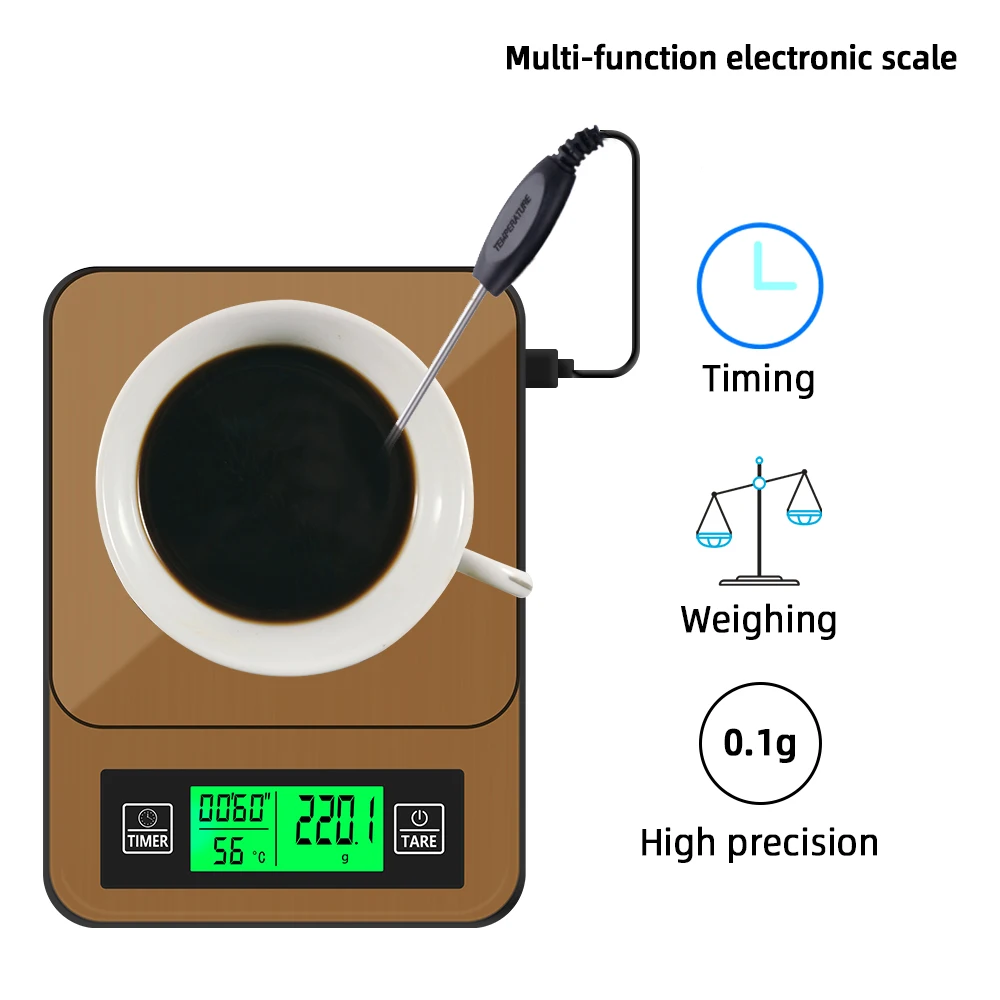 La báscula electrónica de café lavada a mano es una báscula electrónica multifunción con sonda, con pesaje, conversión de unidades, limpieza de pelado, sincronización, función de medición de temperatura, ¡Hermosa! ¡Mini portátil! ¡Exquisito! ¡Es la mejor opción para la vida en el hogar!