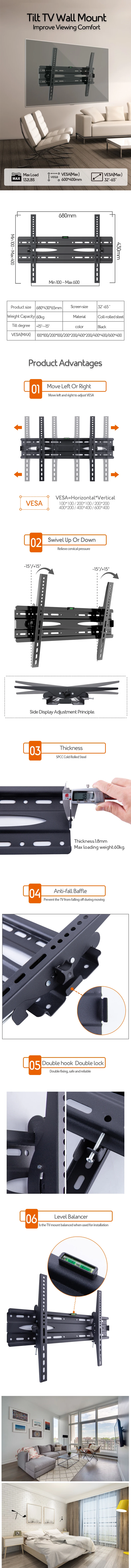 Tipo de producto: Estante para TVColor negroMaterial: tablero de ligadura fríaTamaño de TV compatible: 32 pulgadas a 70 pulgadasAplicar a la distancia del orificio: 100 x 100 mm - 600 x 400 mm (conformidad VESA)Peso de carga: 70 KgCaracterísticas: El soporte para TV se adapta a Tvs de 32-70" de hasta 70 kg., con un espacio máximo de VESA/agujeros de montaje de 600 x 400 mm. Coloque su televisor cerca de la pared, soporte de montaje para televisor de perfil bajo que ahorra mucho espacio y tiene una apariencia elegante. Incline su televisor hacia adelante para reducir el deslumbramiento y lograr una mejor visualización. Fácil instalación con instrucciones decentes, diseño de placa de pared de una sola pieza y todo el hardware incluido en bolsas preetiquetadas.Viene con nivel de burbuja.