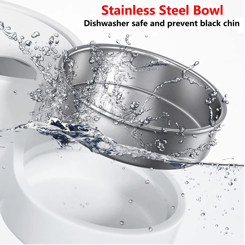 【Cuenco de comida de acero inoxidable】El cuenco de acero inoxidable previene eficazmente la barbilla negra y es apto para lavavajillas. No acumula manchas de aceite, lo cual es conveniente para la limpieza diaria. La altura razonable del cuenco reduce la tensión en el cuello de la mascota y mantiene a las mascotas en una postura óptima de alimentación.