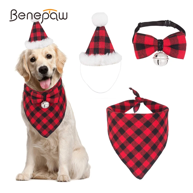 Disfraz de perro de Navidad: 1 bufanda de perro, 1 sombrero de perro, 1 collar de pajarita. Patrón clásico de cuadros rojos, a la moda y nunca pasa de moda. ¡Viste a tu mascota con este bonito traje navideño para perros ahora! Tomemos una foto y grabemos el hermoso momento.
