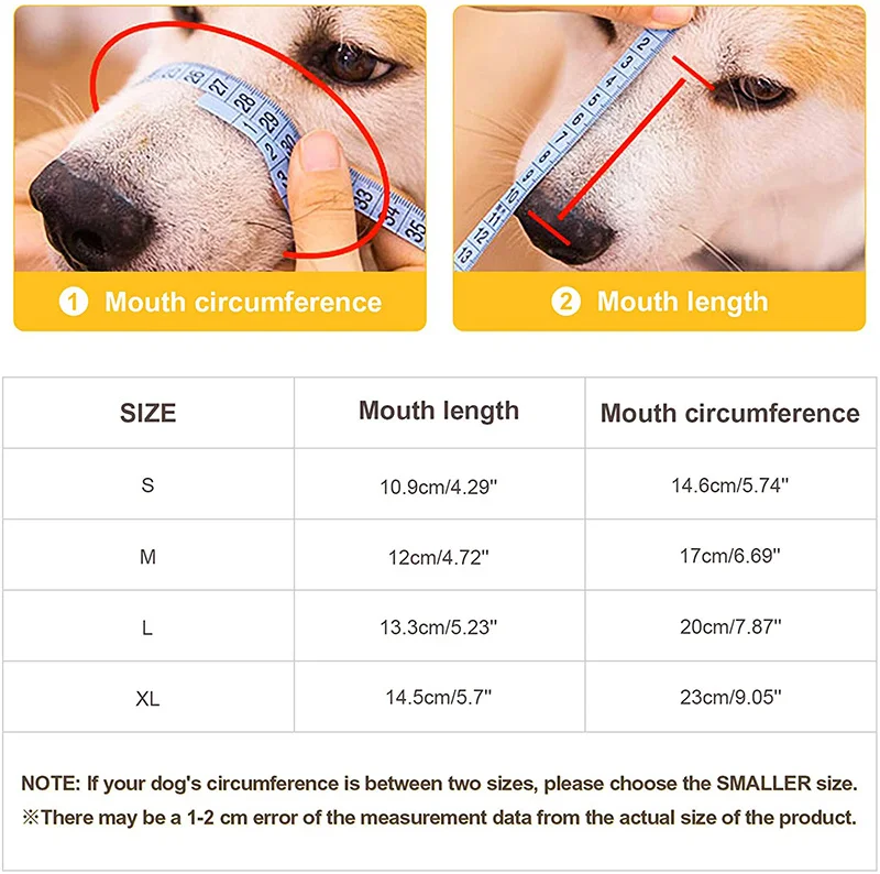 GUÍA DE TAMAÑO PARA ELEGIR MEJOR ---Puede elegir el bozal adecuado para perros midiendo la circunferencia y la longitud de la boca del perro. NOTA: Si la circunferencia de su perro está entre dos tamaños, el tamaño MÁS PEQUEÑO sería mejor.