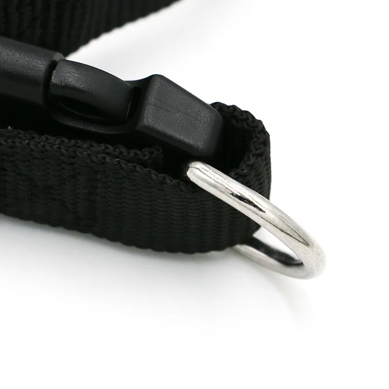 Bucle de nylon en lugar de la cadena ordinaria. Diseño cómodo con hebilla a presión de liberación rápida, que ofrece fácil de poner y quitar en un segundo. Anillo D para fijación de correa.