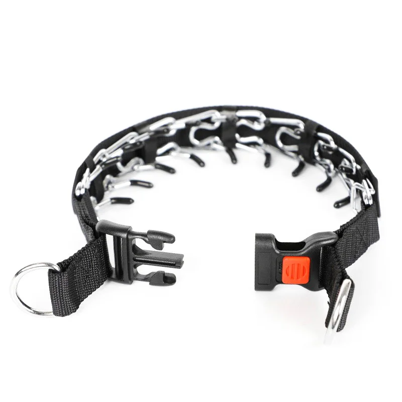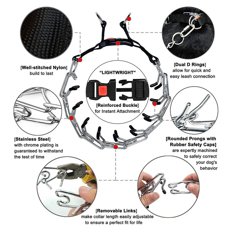 Fuerte y duradero Hecho de acero inoxidable de alta calidad, este collarín para perros está diseñado para durar.Además, este collar de perro tiene una hebilla de liberación rápida diseñada a medida para que asegurar y quitar la correa de su perro sea muy fácil.Una aplicación segura y cómoda para tu perro te hará la vida mucho más fácil.