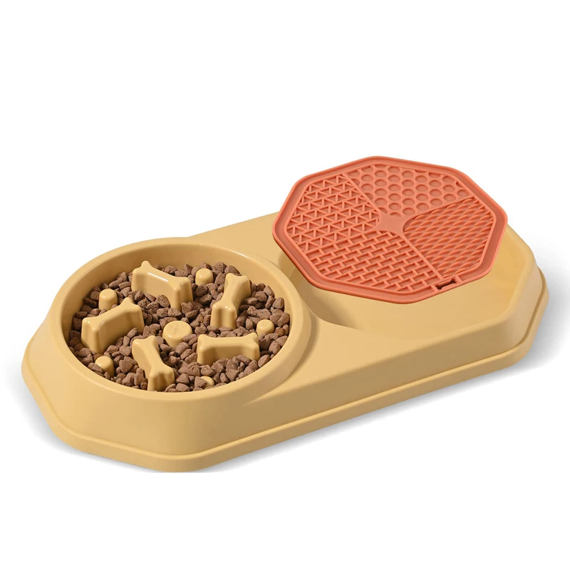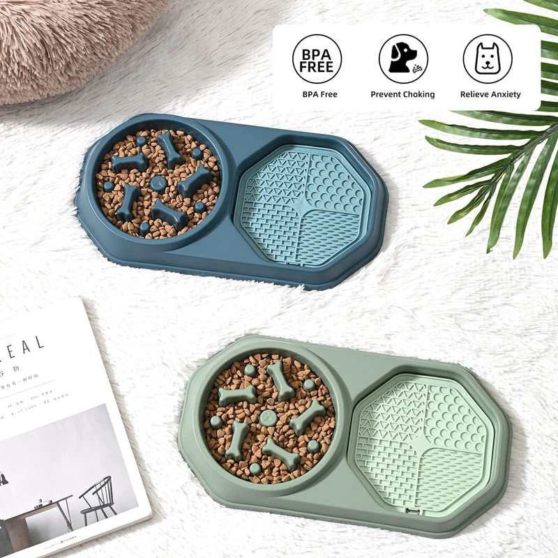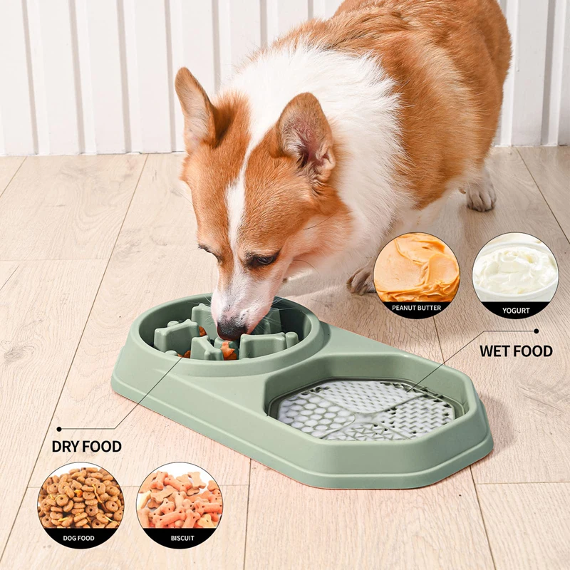 Alimentos secos y húmedos separados-El diseño único 2 en 1 del alimentador lento combina perfectamente el cuenco de comida lenta y la alfombra para lamer. El cuenco de comedero lento puede contener comida seca para perros, mientras que la almohadilla para lamer se utiliza para alimentos blandos, como mantequilla de maní, calabaza, yogur, manzana, etc. La alfombrilla para lamer se fija junto al cuenco del alimentador lento, no será sacada ni masticada ni rasgada por sus amigos peludos, Y no tienes que preocuparte de ensuciar el suelo.