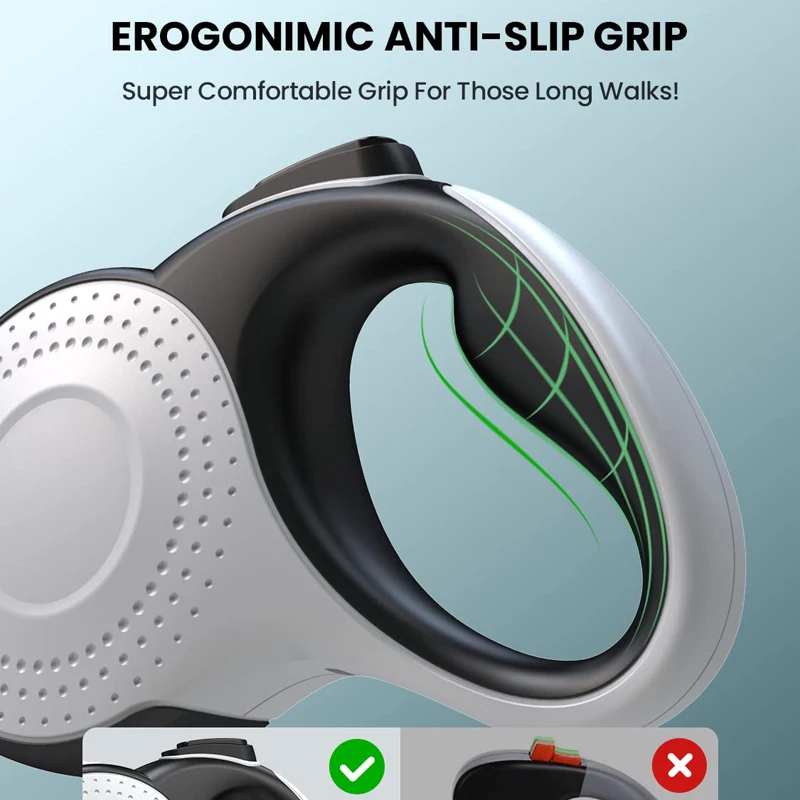 【FÁCIL DE USAR】 Botón de bloqueo y desbloqueo rápidos, fácil de enrollar y enrollar solo con el pulgar. Le permite ajustar la distancia entre usted y sus perros en cualquier momento, protege la seguridad de las mascotas y otros peatones
