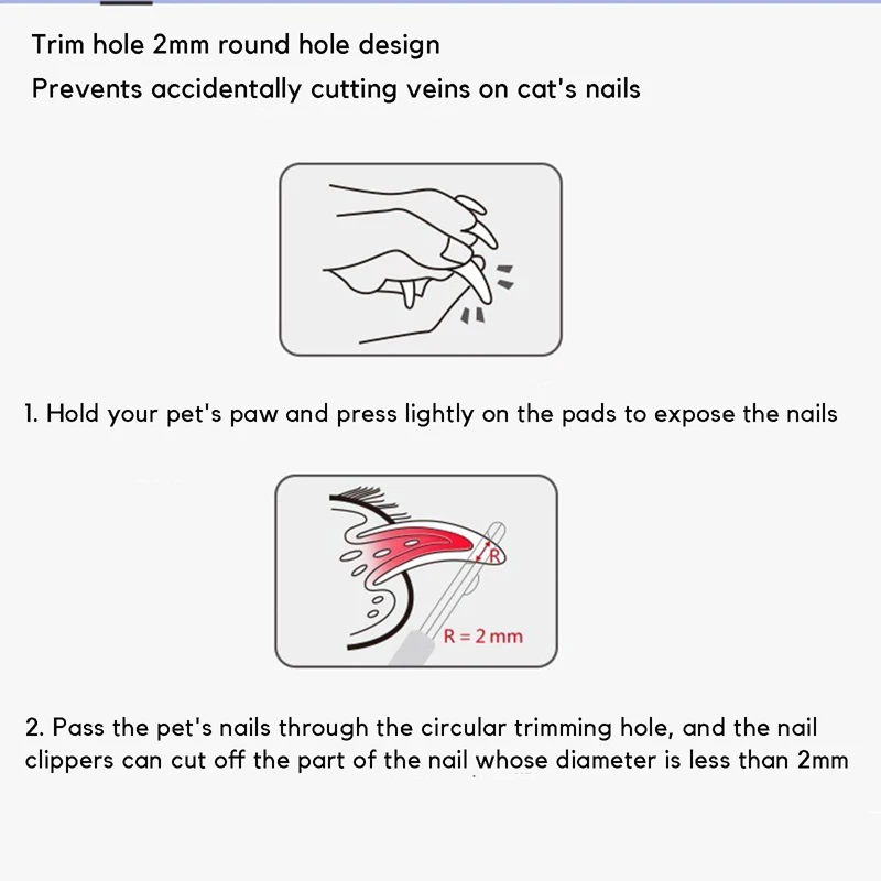 Pasa las uñas de la mascota a través del orificio de recorte circular, y Los cortaúñas pueden cortar la parte de la uña cuyo diámetro es inferior a 2mm