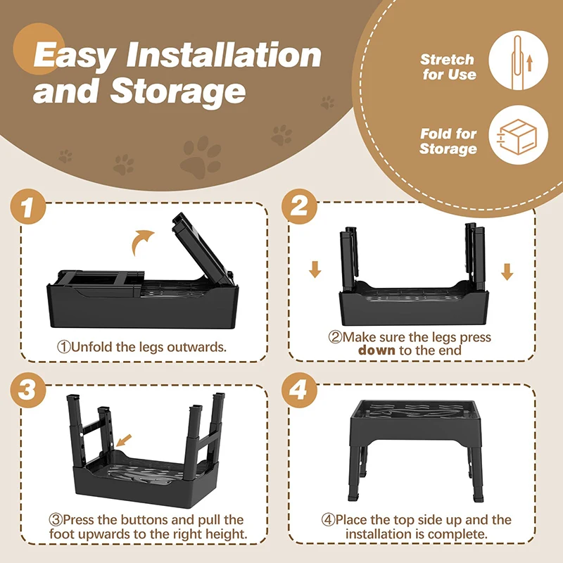 【Fácil de usar e instalar】Este cuenco elevado para perros grandes es muy fácil de montar sin herramientas: (1) Despliegue las piernas hacia afuera (2) Asegúrese de que las piernas presionen hasta el final (3) Presione los botones y tire del pie hacia arriba a la altura correcta (3) hacia arriba y la parte superior Coloque habrá terminado la instalación).