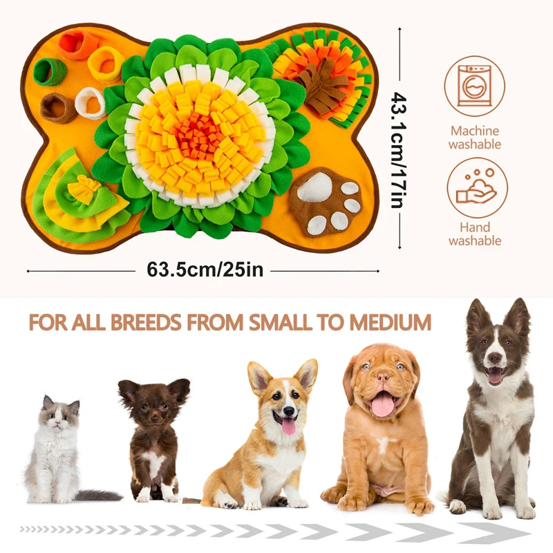【Para perros pequeños y medios】La dimensión de la alfombrilla de comida para perros es de 63,5 cm x 43,1 cm/25 pulgadas x 17 pulgadas, adecuada para la gran mayoría de perros pequeños a medianos. Esta alfombra de rompecabezas para perros es muy fácil de limpiar. Se puede lavar a máquina pero sugerimos lavar a mano.