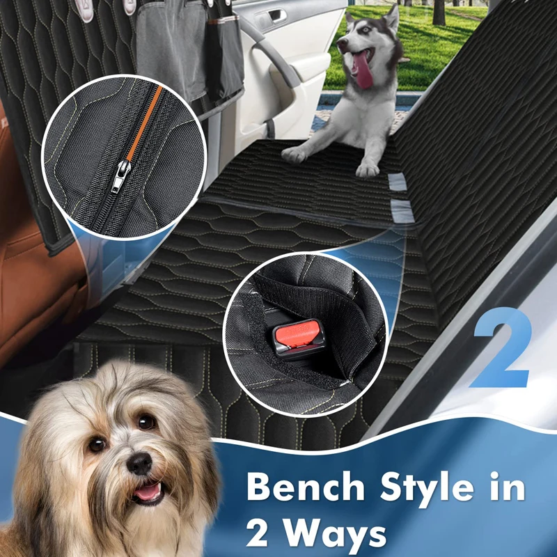 ¡Más formas de abrirlo!-La funda del asiento del coche para perros para el asiento trasero con solapas laterales se puede cambiar fácilmente a estilos de Hamaca, evitando que el perro salte sobre las manijas de las puertas y los alféizares de las ventanas y se deslice del asiento en paradas repentinas; la hamaca para perros para coche también se puede abrir como parte para encajar en el asiento delantero. El maletero se puede cubrir completamente con la funda del asiento. ¡Protección integral para su coche!