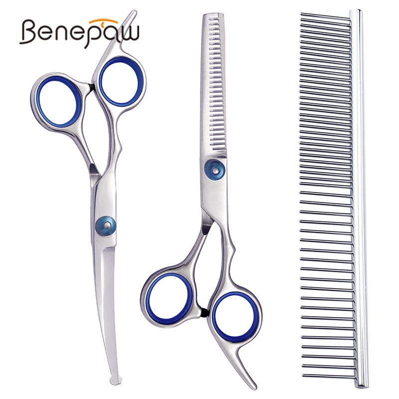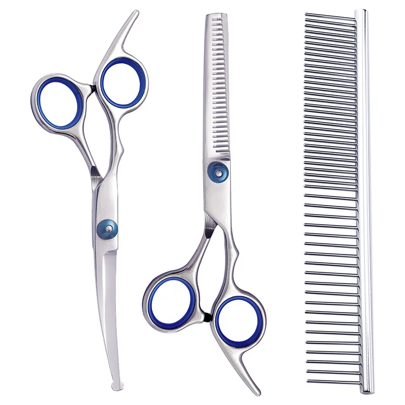 Kit de dos tijeras de aseo-Tijeras profesionales para perros para el aseo con 1 x tijeras curvas, 1 x tijeras de adelgazamiento, 1 x peine de aseo, puede recortar la piel del cuerpo con cuchillas lisas.