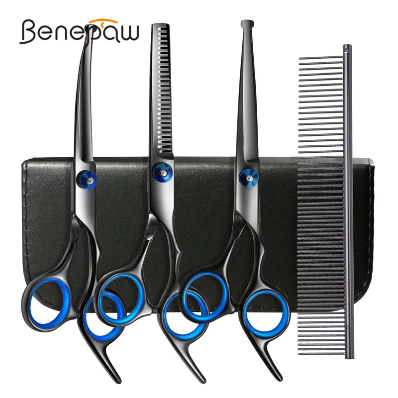 Kit de tijeras profesionales para el cuidado de mascotas-El kit incluye 1 cizalla de adelgazamiento de 6,5 pulgadas, 1 tijera curva de 7 pulgadas, 1 tijera recta de 7 pulgadas, 1 peine para mascotas, 1 funda de cuero negro