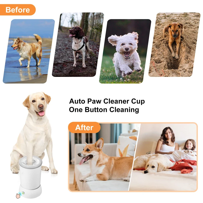 [Fácil de usar] Agregue agua y champú (si lo prefiere) a la taza de la lavadora de patas, inserte patas fangosas, presione el botón, el cepillo de silicona suave eliminará el polvo y la suciedad rápidamente, no es necesario girar y girar manualmente y no dañar la pata de la mascota durante la operación.