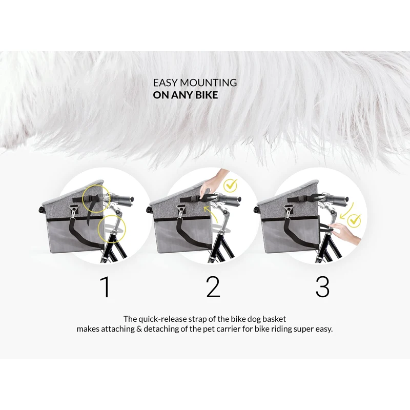 Fácil de colocar-La correa de liberación rápida de la cesta de la bicicleta para perros hace que sujetar y separar el transportador de mascotas para montar en bicicleta sea súper fácil. Equipo de montaje e instrucciones paso a paso.