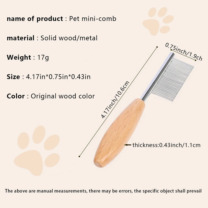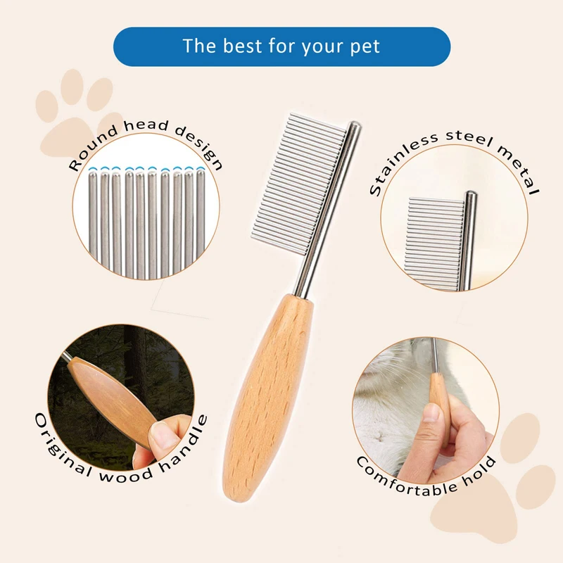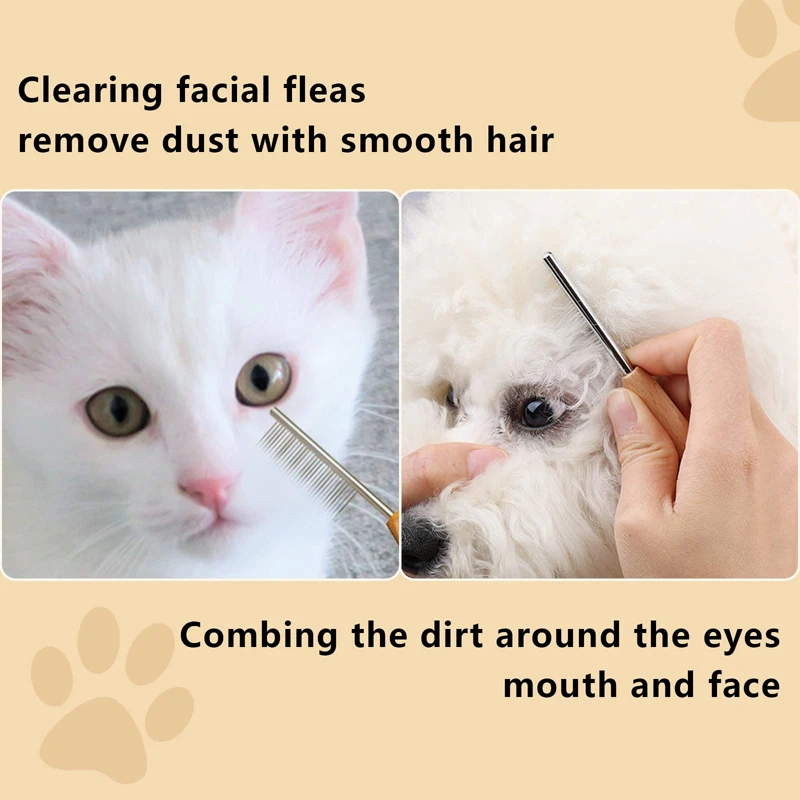 【Fácil de limpiar】Los dientes del Peine del peine facial de la mascota están hechos de acero inoxidable, y el mango está hecho de madera maciza y revestimiento impermeable. Puede ponerlo directamente en el agua para limpiarlo y esperar a que se seque el aire natural, sin perder el tiempo