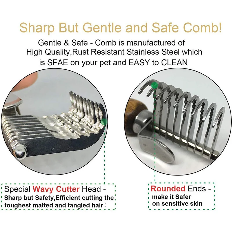 DISEÑO ABSOLUTAMENTE SEGURO: nuestro removedor de esteras está diseñado con extremos redondeados fuera de los dientes, lo que lo hace seguro en la piel de su mascota. Mientras tanto, el lado interior de los dientes es lo suficientemente afilado como para cortar suavemente las alfombrillas, enredos y nudos más resistentes.