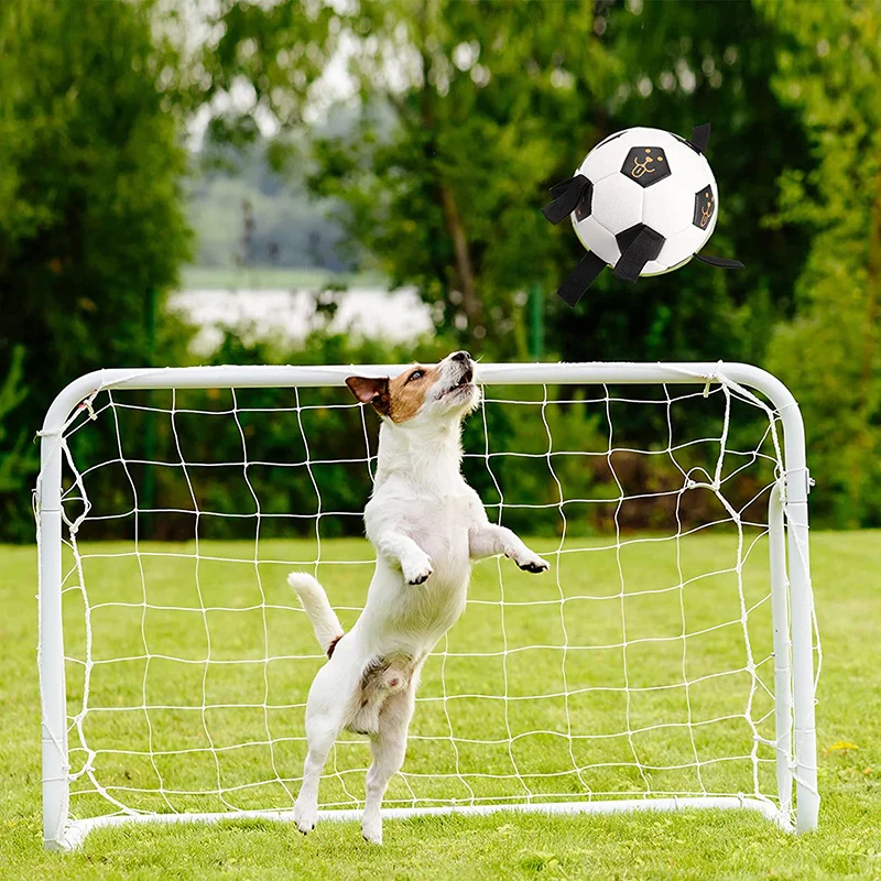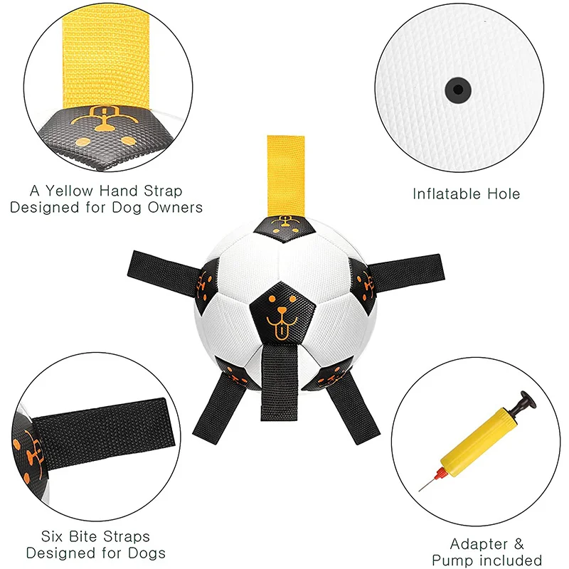 Reducir la demolición de casas por perros:Tome esta pelota de fútbol interactiva y juegue con su perro en el césped, lo que puede liberar el exceso de energía del perro y reducir el comportamiento travieso. Gracias a las seis correas negras adjuntas, puede agarrarlo fácilmente y correr.