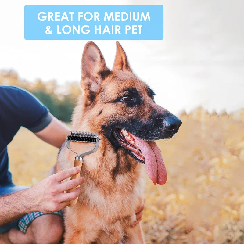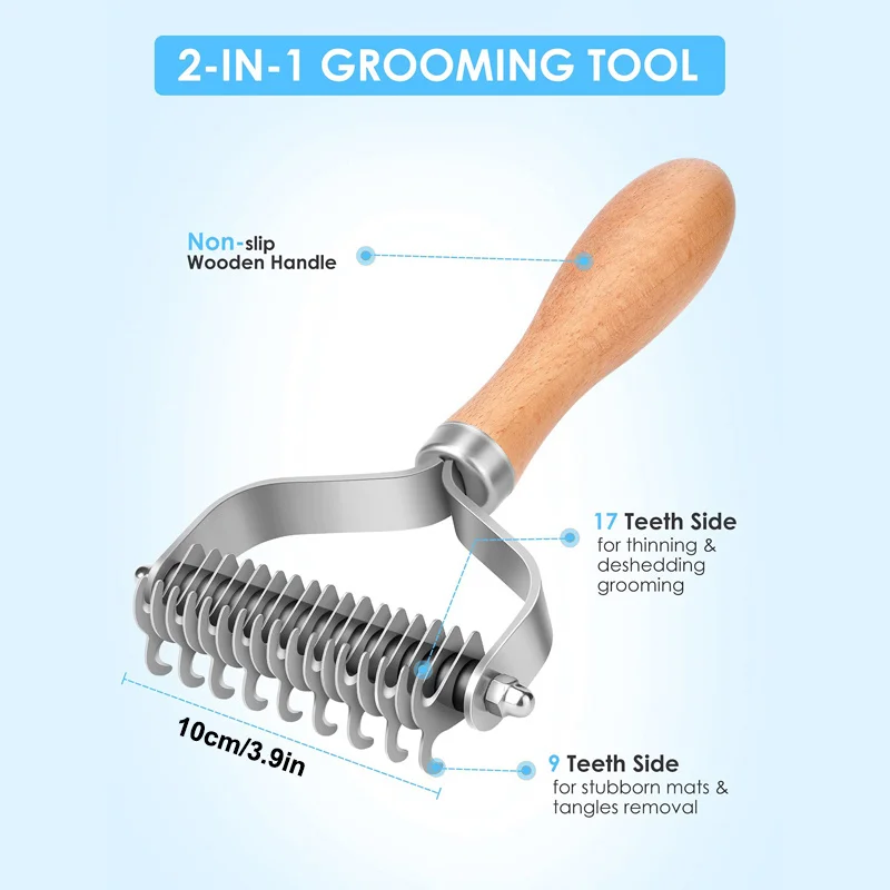 【Cabezal de doble lado】Comience con un lado de 9 dientes para cortar esteras y enredos difíciles, termine con un lado de 17 dientes para adelgazar y desenredar. Perfecto para mascotas de pelo medio/largo con una capa gruesa o doble, NO recomendado para mascotas de pelo corto.